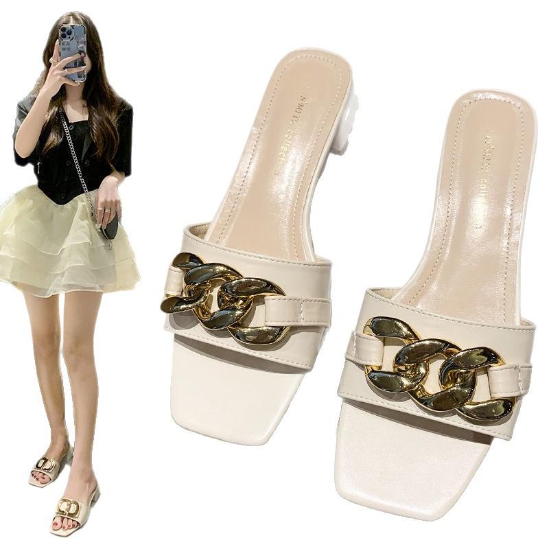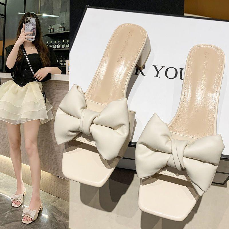 Новые летние сандалии на толстом каблуке, популярные в интернете, крутые шлепанцы с открытым носком, на среднем каблуке, с бантом, модные трендовые шлепанцы, женская обувь