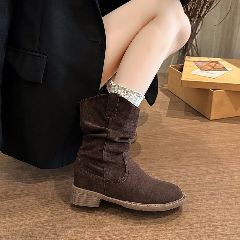 Ретро плиссированные ботинки на толстом каблуке женские короткие ботинки 2025 новые осенние Мартин тонкие ботинки V-образный вырез тонкие ботинки-рыцари