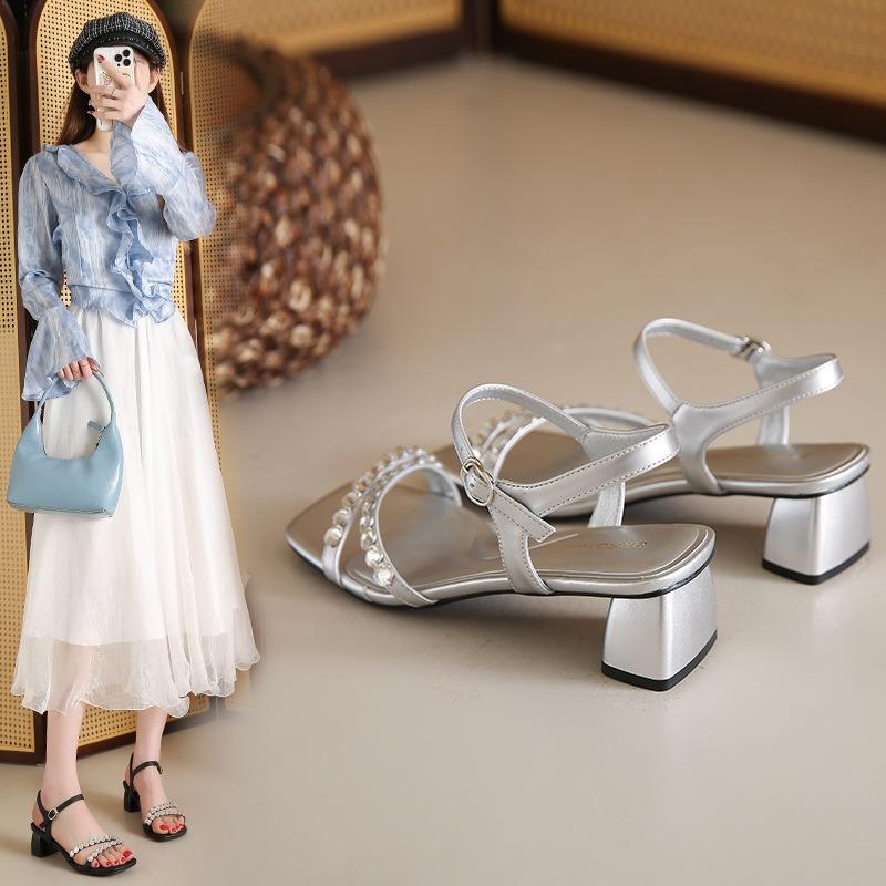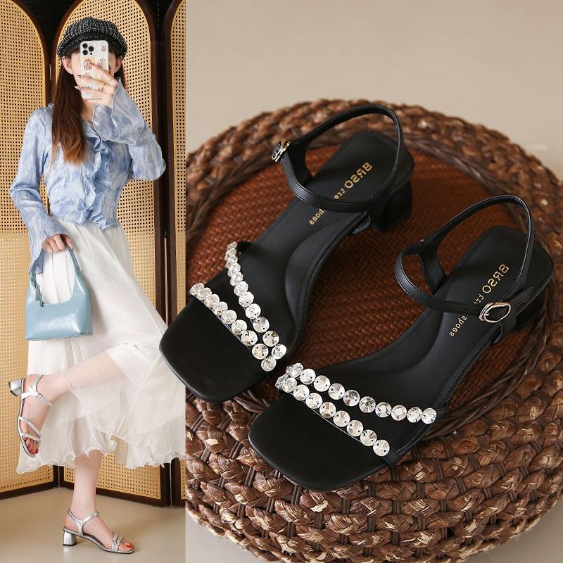 Женские босоножки со стразами на юбке, на толстом каблуке, новинка летней обуви, с ремешком на щиколотке
