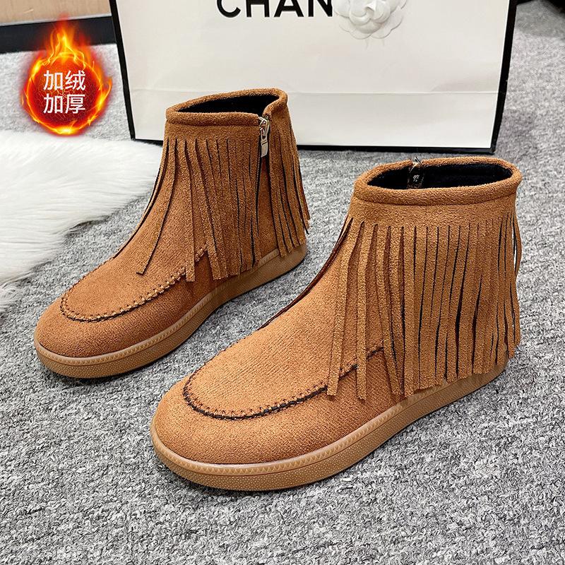 Удобные женские ботинки большого размера с короткой бахромой, новые осенне-зимние, милые, универсальные, из бархата, на плоской подошве