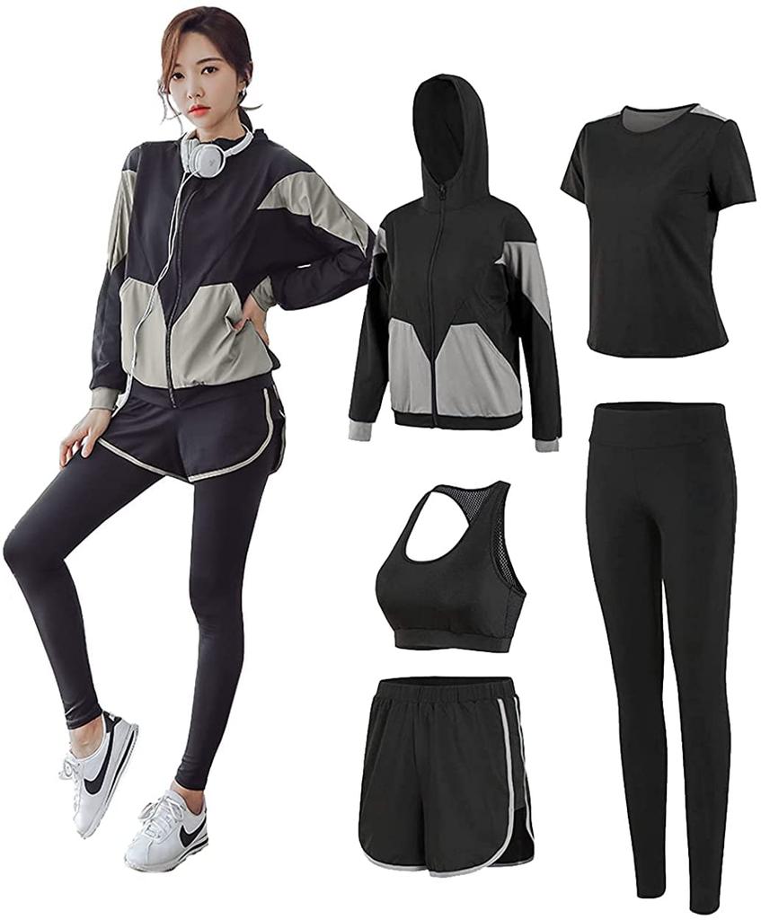 5 комплектов включают в себя: спортивный бюстгальтер, футболка, спортивная толстовка с капюшоном, шорты и леггинсы