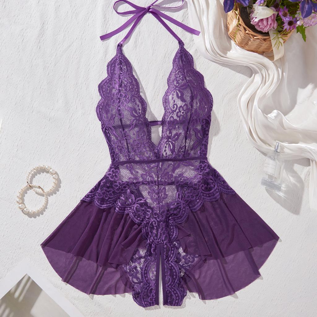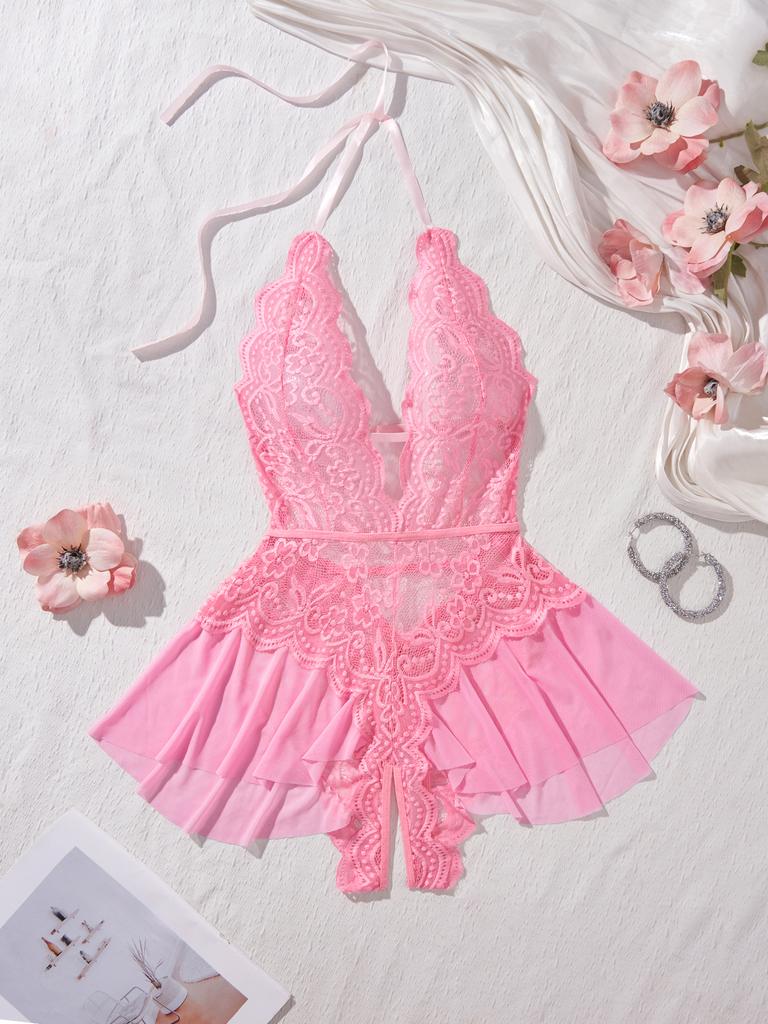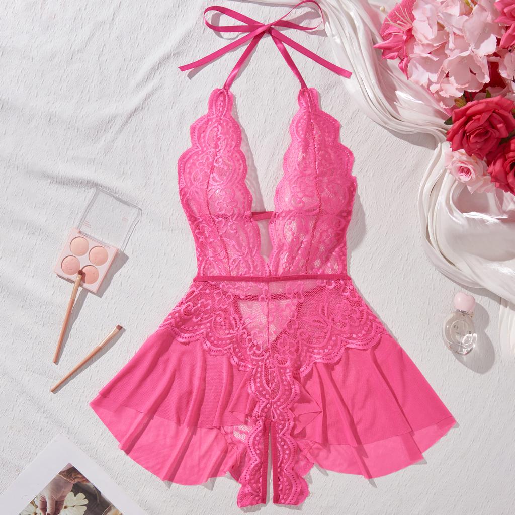 Новое сексуальное розовое белье без ластовицы женский комплект кружевной пэчворк полый боди эротическая пижама Тедди платье бэбидолл глубокий V открытый бюстгальтер
