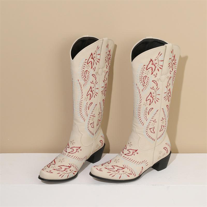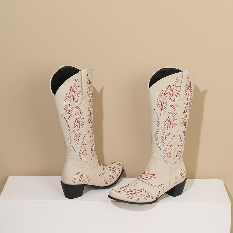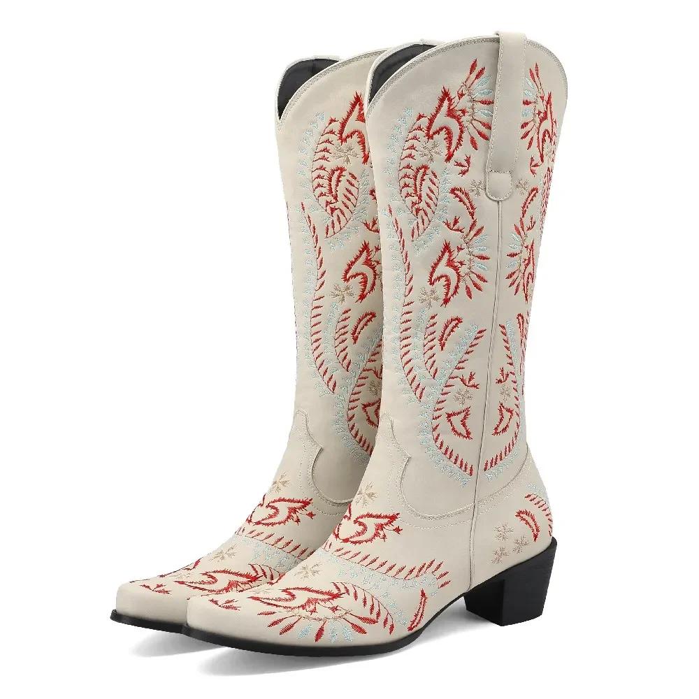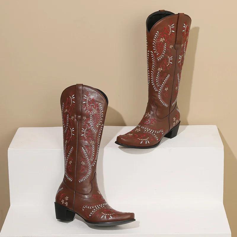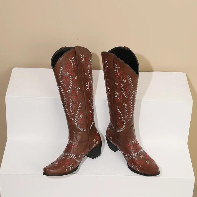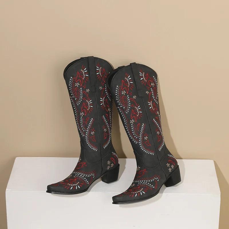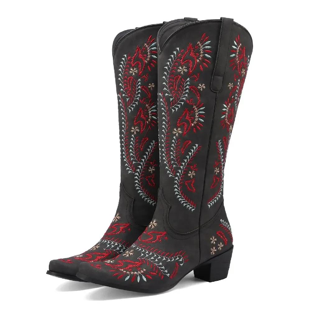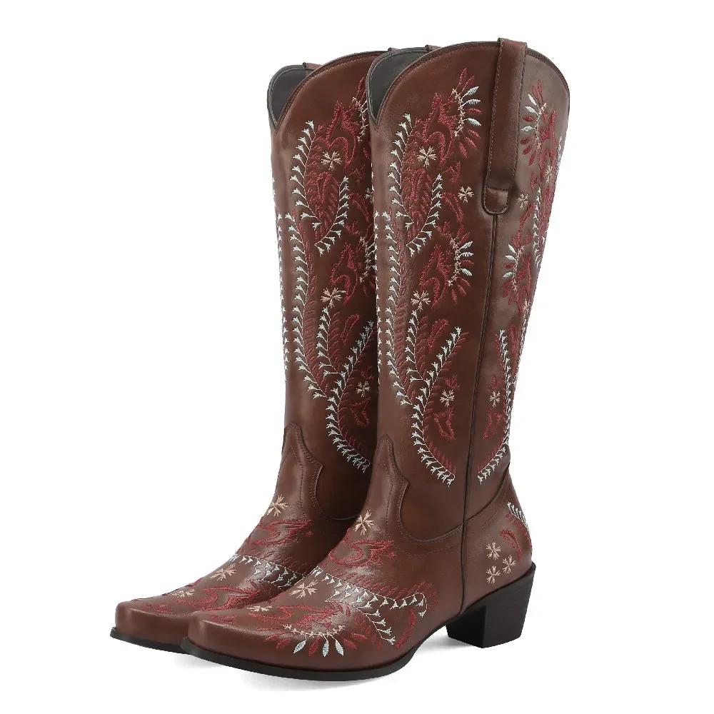 Вышивка Западные Женские Сапоги до Колена Коричневые Черные ПУ Квадратный Каблук Зимние Круглый Носок Винтажные Ковбойские Ковбойские Слипоны Длинные Сапоги