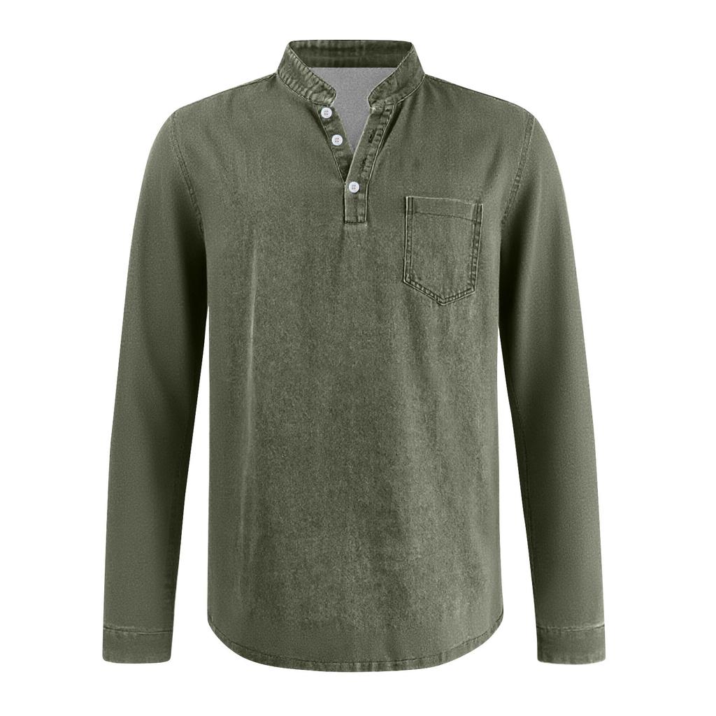 Мужской однотонный выстиранный спортивный топ с карманом на пуговице и воротником-стойкой, с длинным рукавом