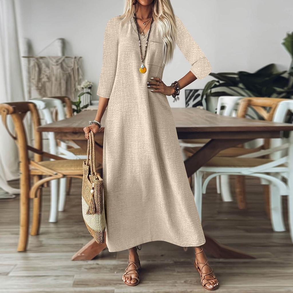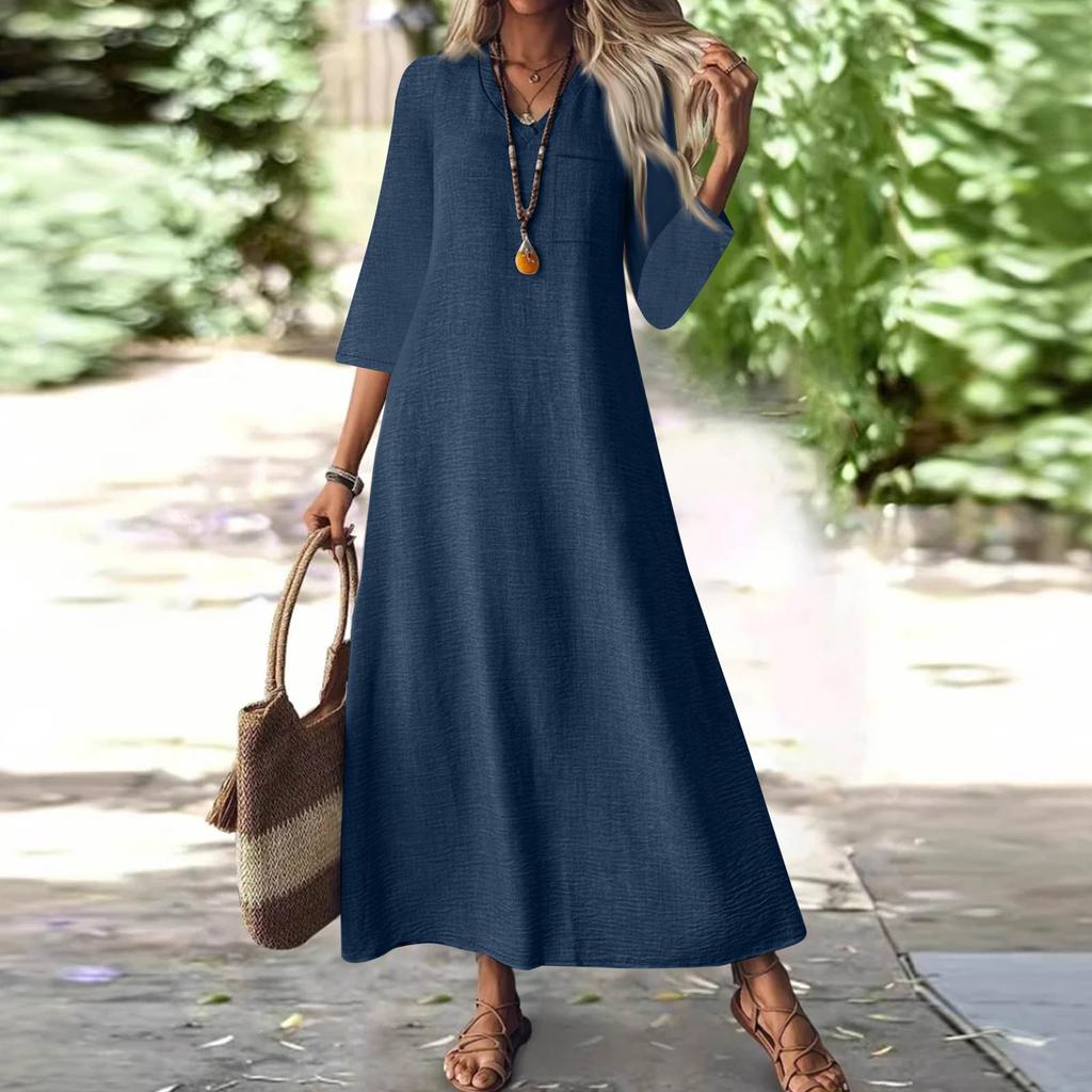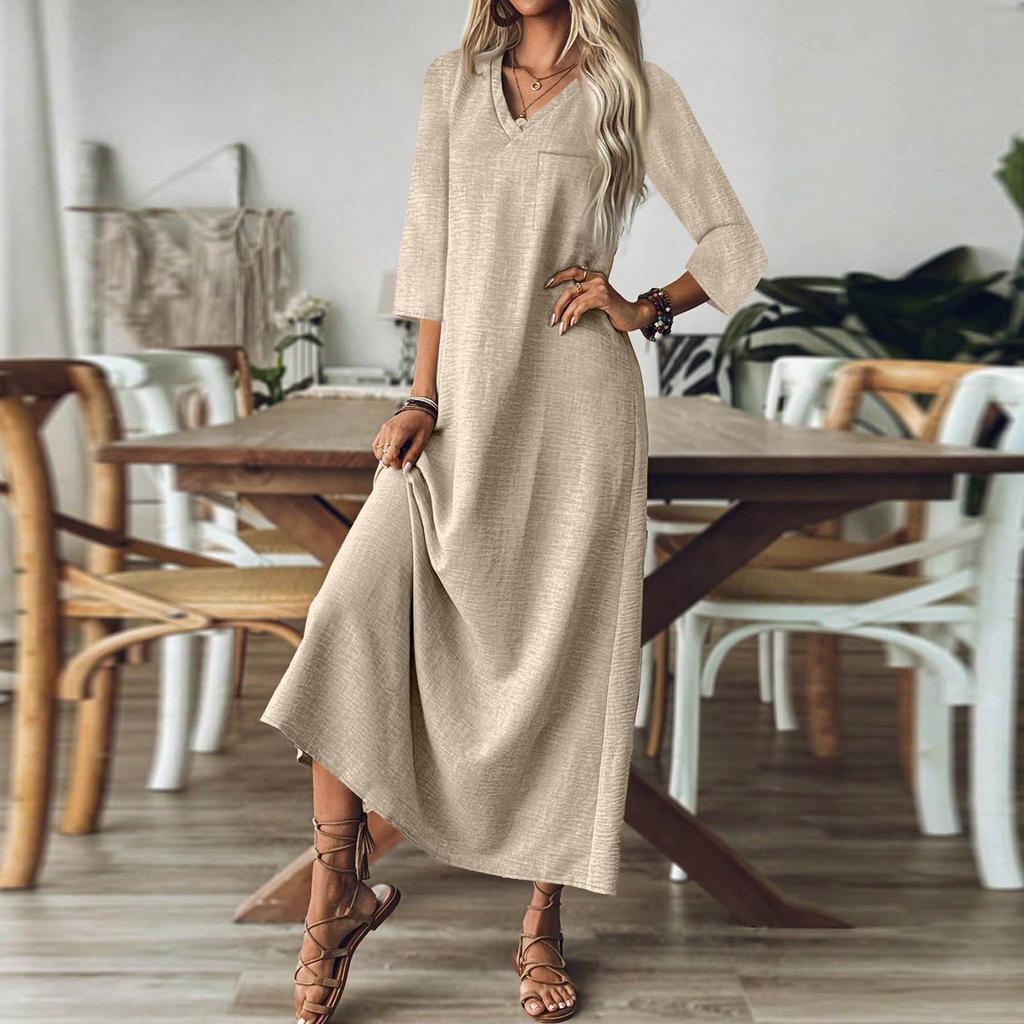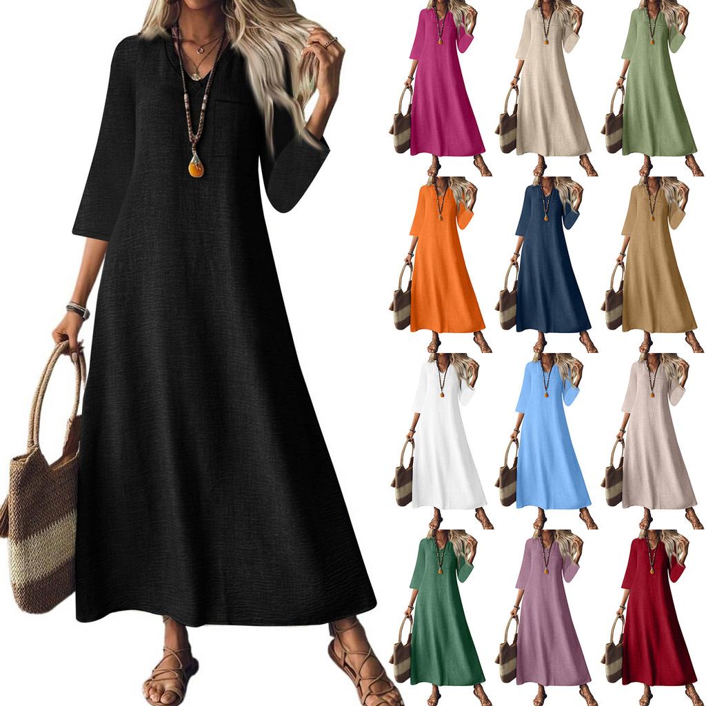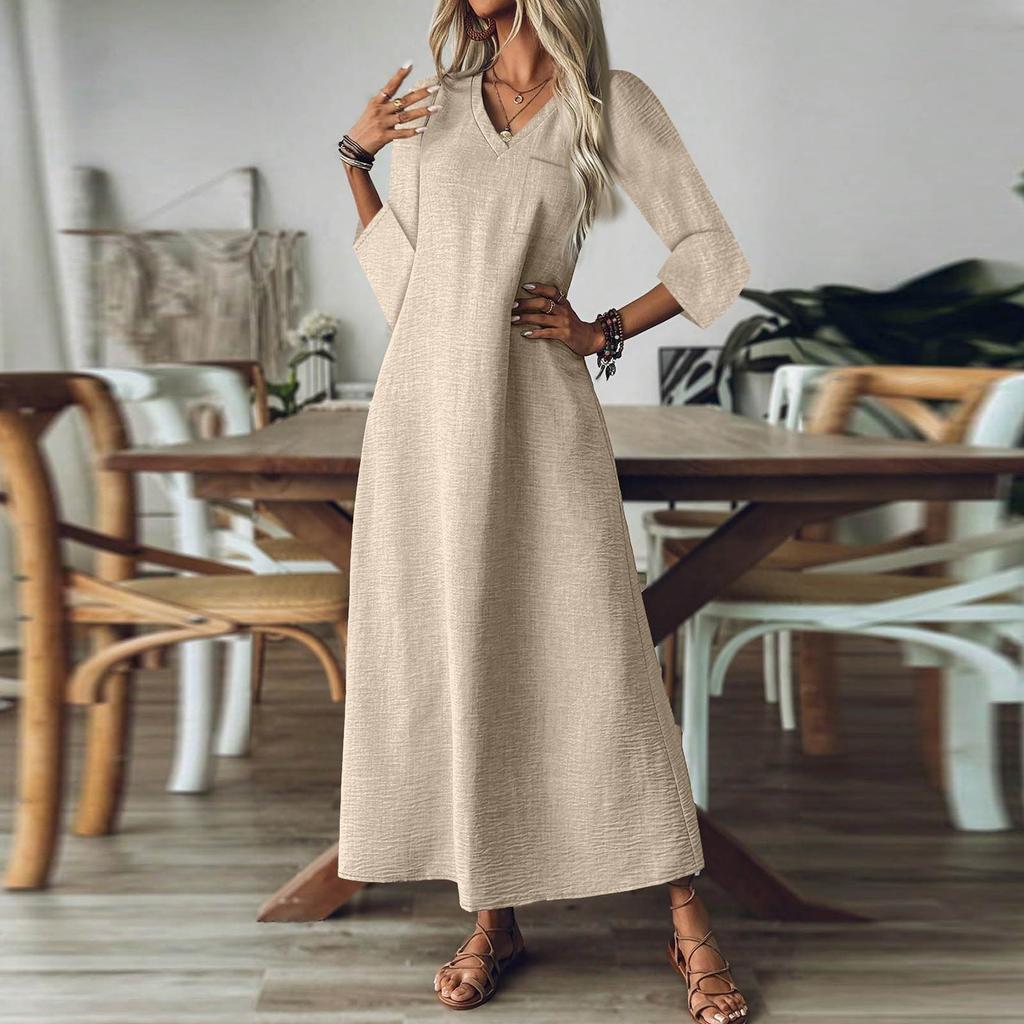 Женская мода V-образный вырез рукав семь карман однотонный молния повседневный отпуск длинные хлопково-льняные платья