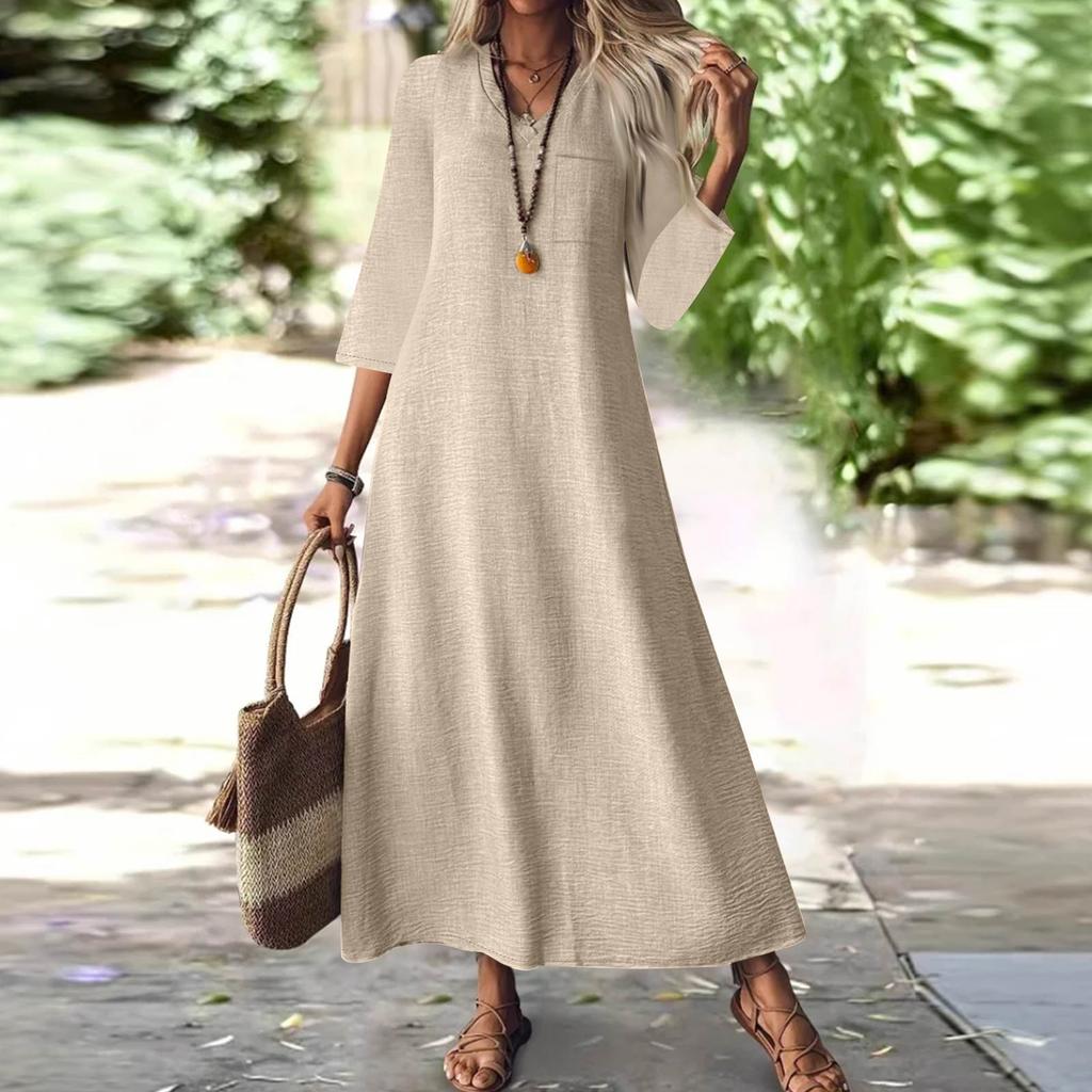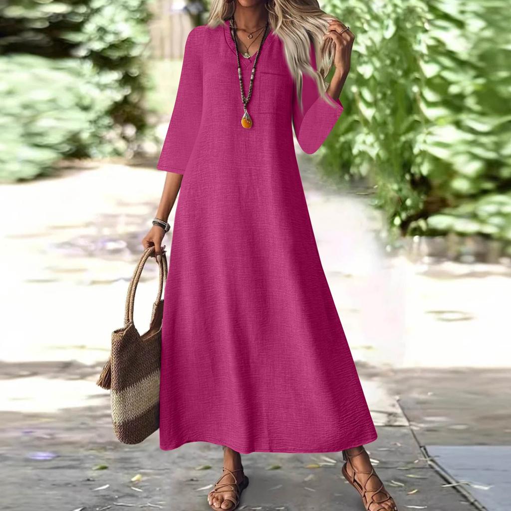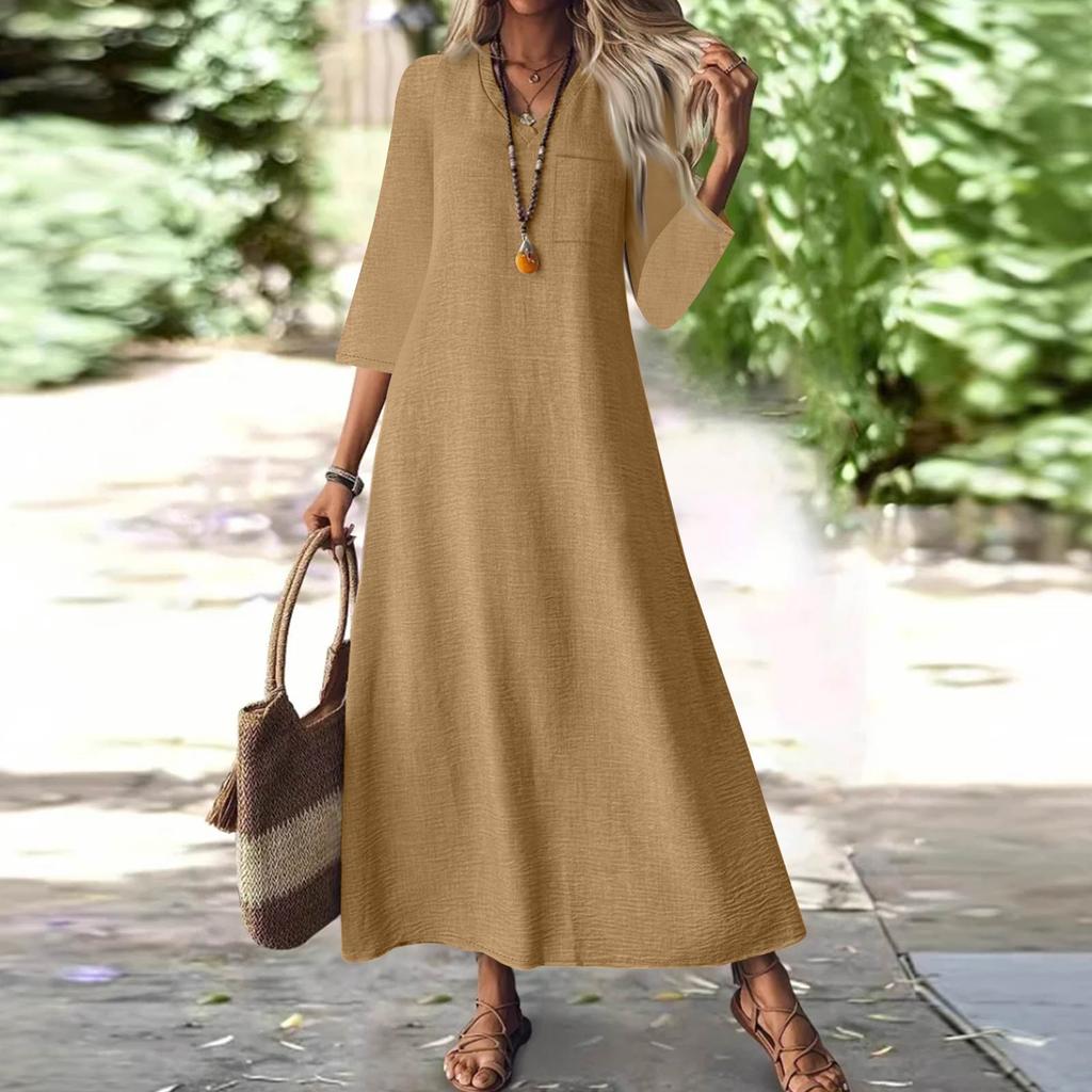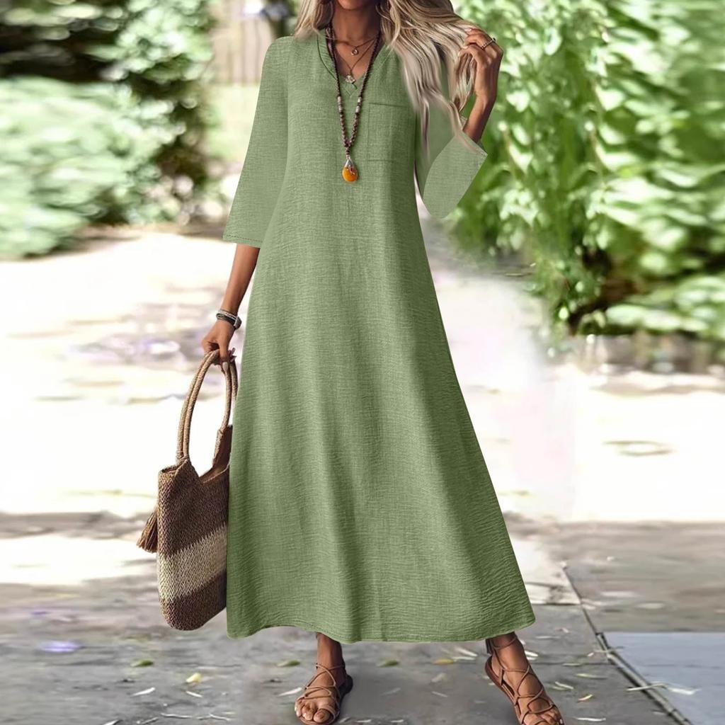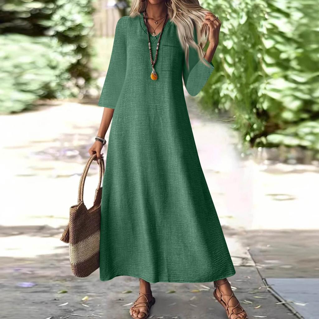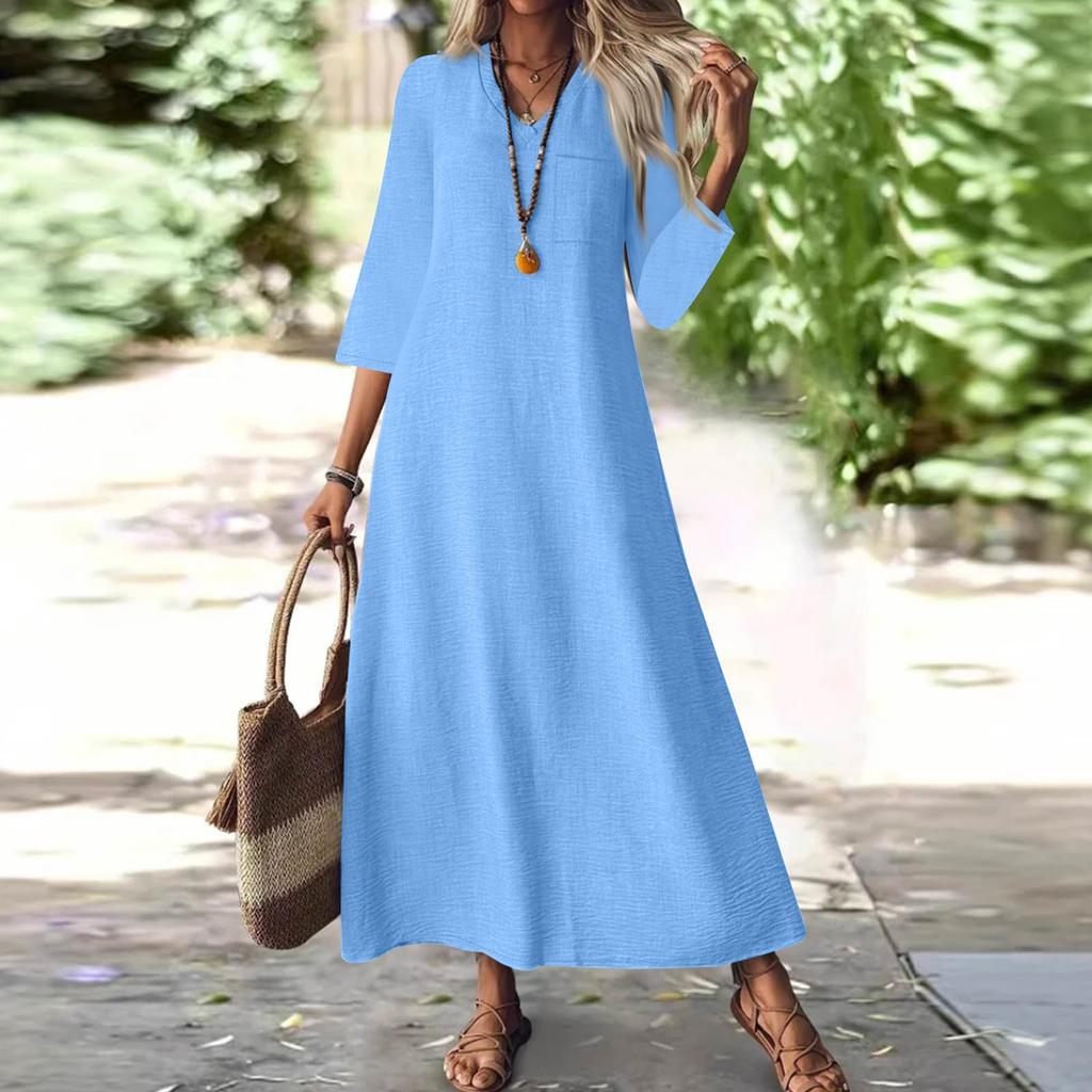 Женская мода V-образный вырез рукав семь карман однотонный молния повседневный отпуск длинные хлопково-льняные платья