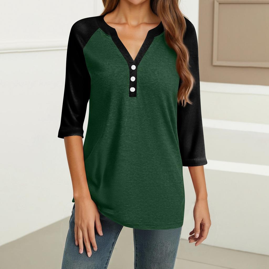 Женская мода повседневная футболка с рукавами реглан, колор-блок, V-образным вырезом, рукавами три четверти, декоративными пуговицами