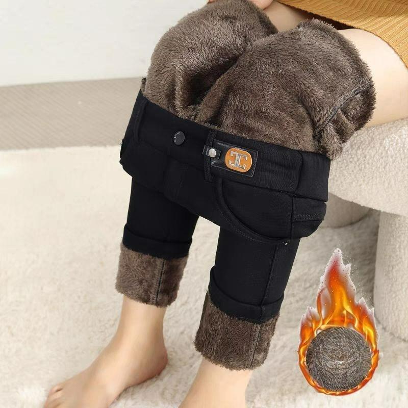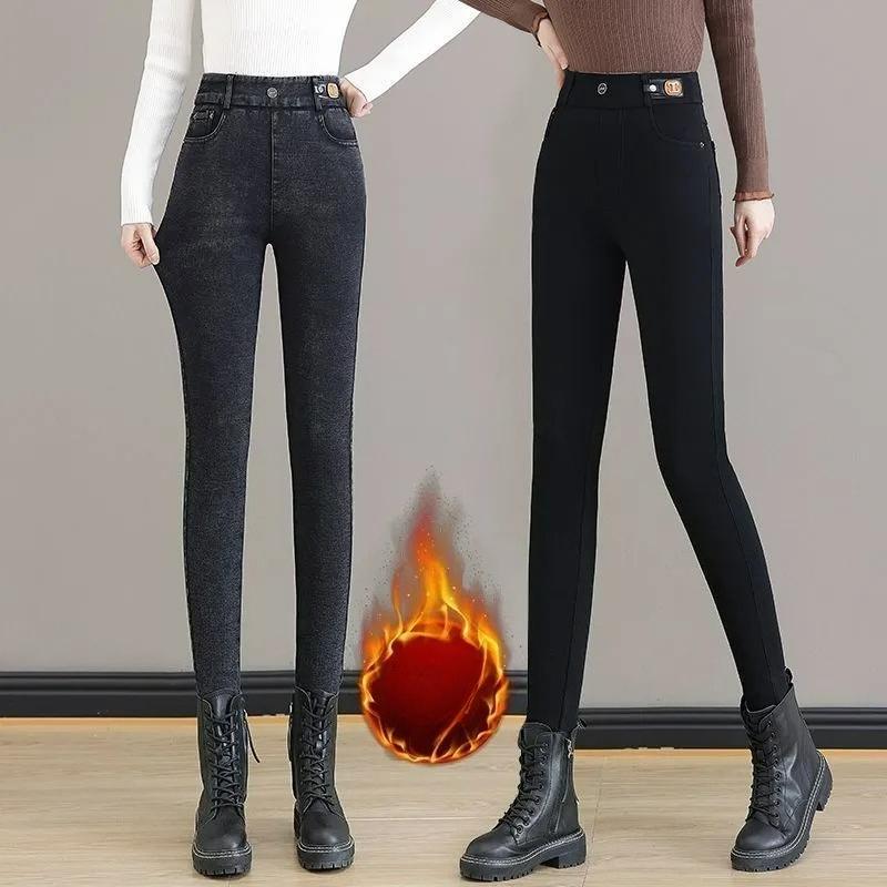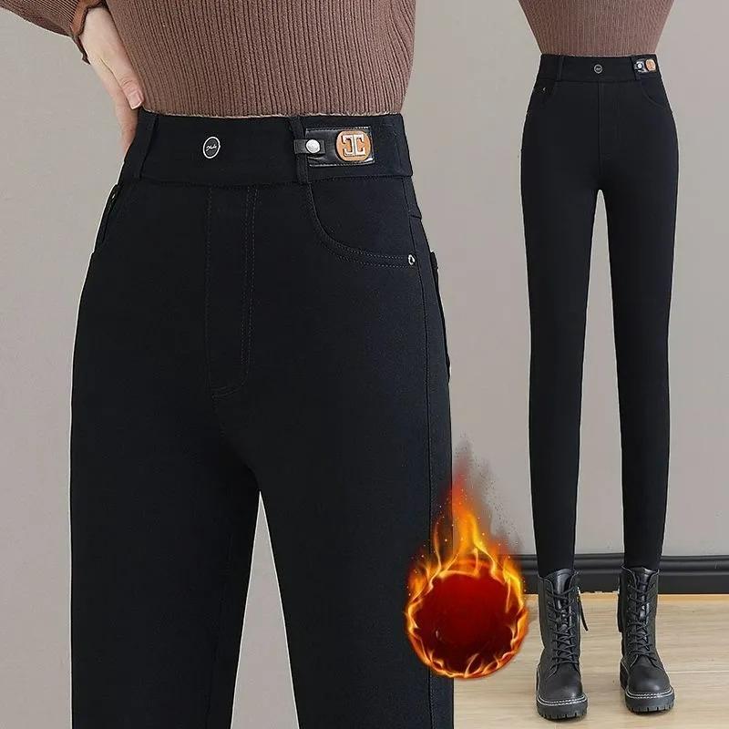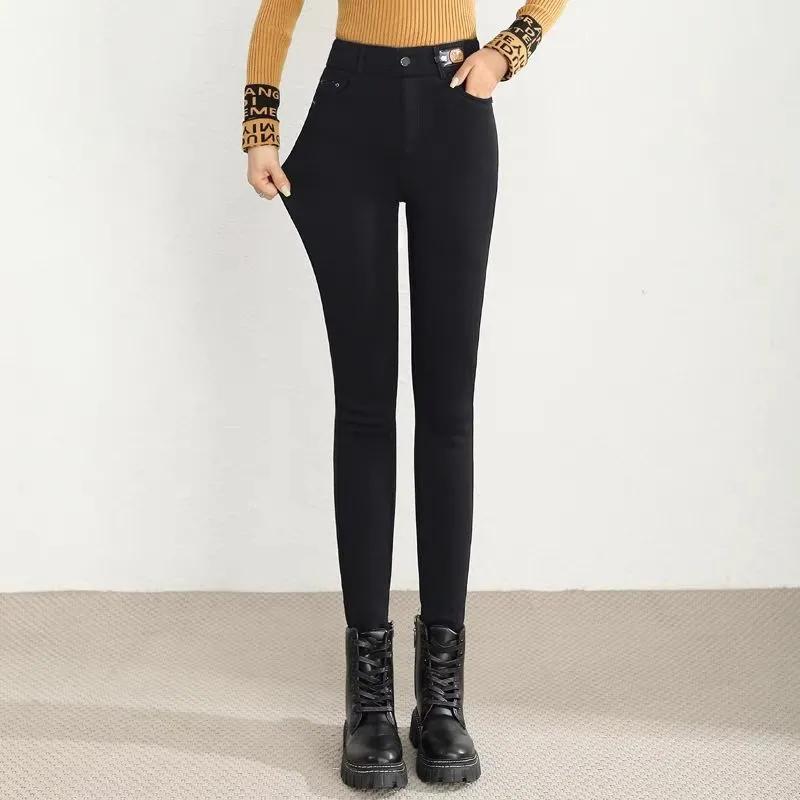 Женские осенне-зимние брюки из флиса из овечьей шерсти, с высокой посадкой, стрейч, облегающие, тонкие, черные, для тепла, джинсовые, теплые хлопковые брюки