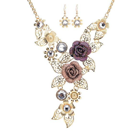 Женщины горный хрусталь инкрустация полый лист цветок кулон серьги ожерелье комплект ювелирных изделий