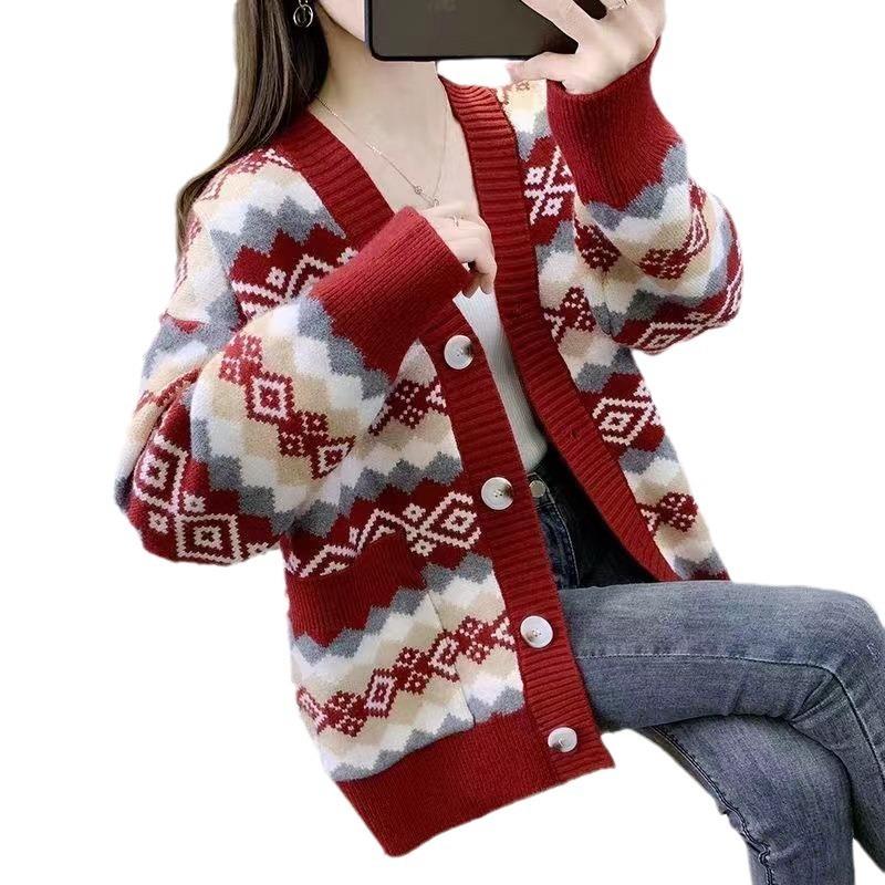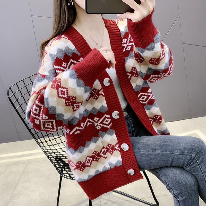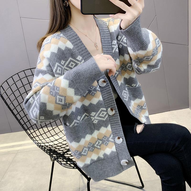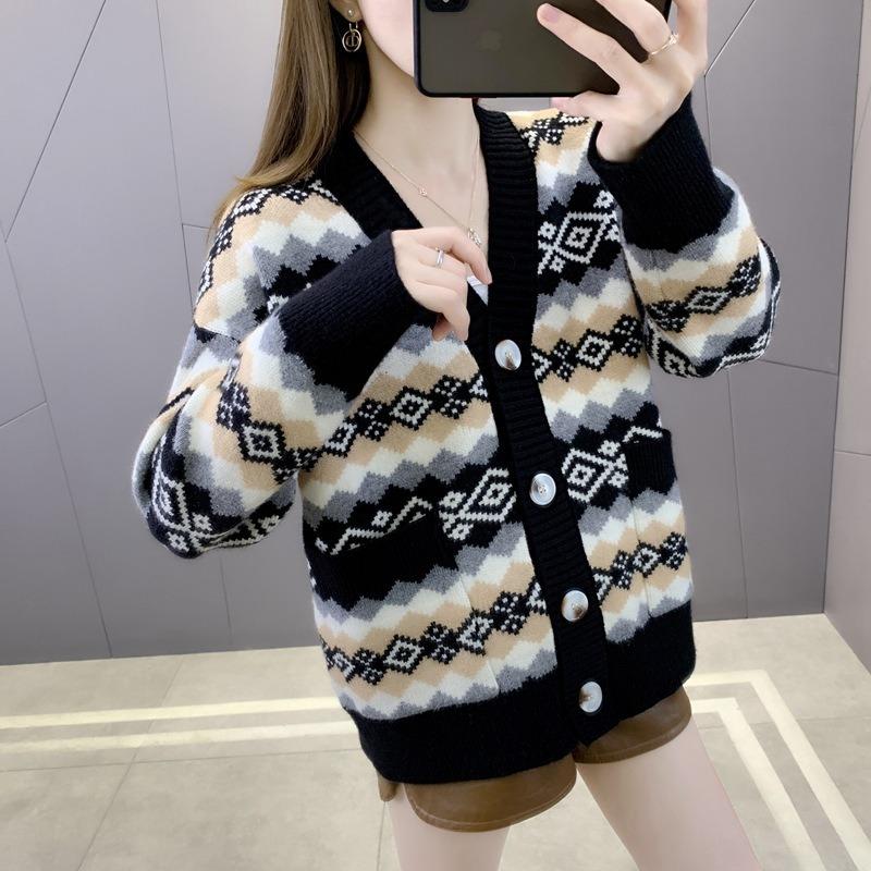 Осень и зима новый вязаный кардиган ретро ромбовидная клетка ленивый ветер свободный свитер куртка женская
