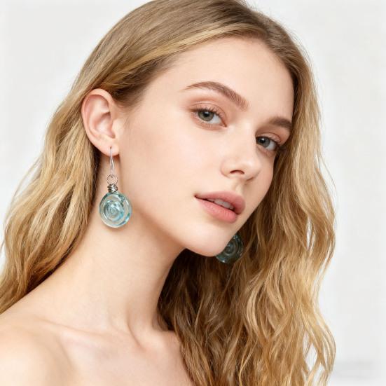 Сложный процесс ручной работы включает плавление и формование стекла при высоких температуратурах для создания отличительной текстуры и блеска.. Эти серьги, выполненные в виде потрясающей спирали с прозрачными сине-зелеными нитями, излучают элегантность и естественную красоту..