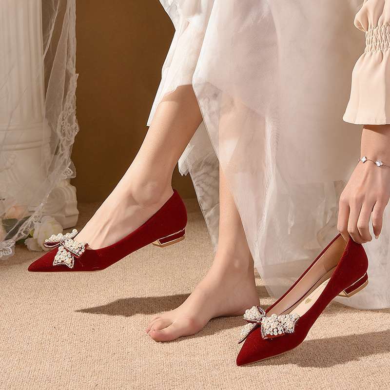 Красные свадебные туфли женские весна 2025 новые на плоской подошве туфли невесты не утомляют, беременные женщины могут дважды надевать свадебные платья Сюхэ