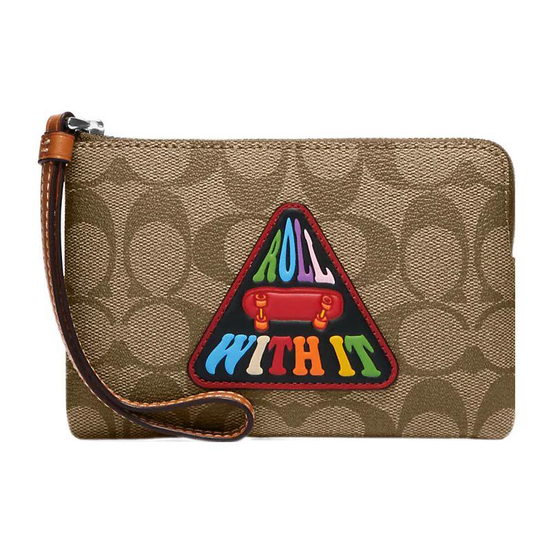 Новый холщовый кошелек COACH Corner Zip с кожаной отделкой, сумка-клатч на запястье, маленький размер, женский, коричневый CK359-SVOT8 — купить товар онлайн с бесплатной доставкой до всему миру!