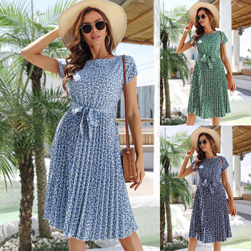 Летнее милое платье в цветочек с плиссировкой, шнуровкой на талии и круглым вырезом, с короткими рукавами — купить товар онлайн с бесплатной доставкой по всему миру!
