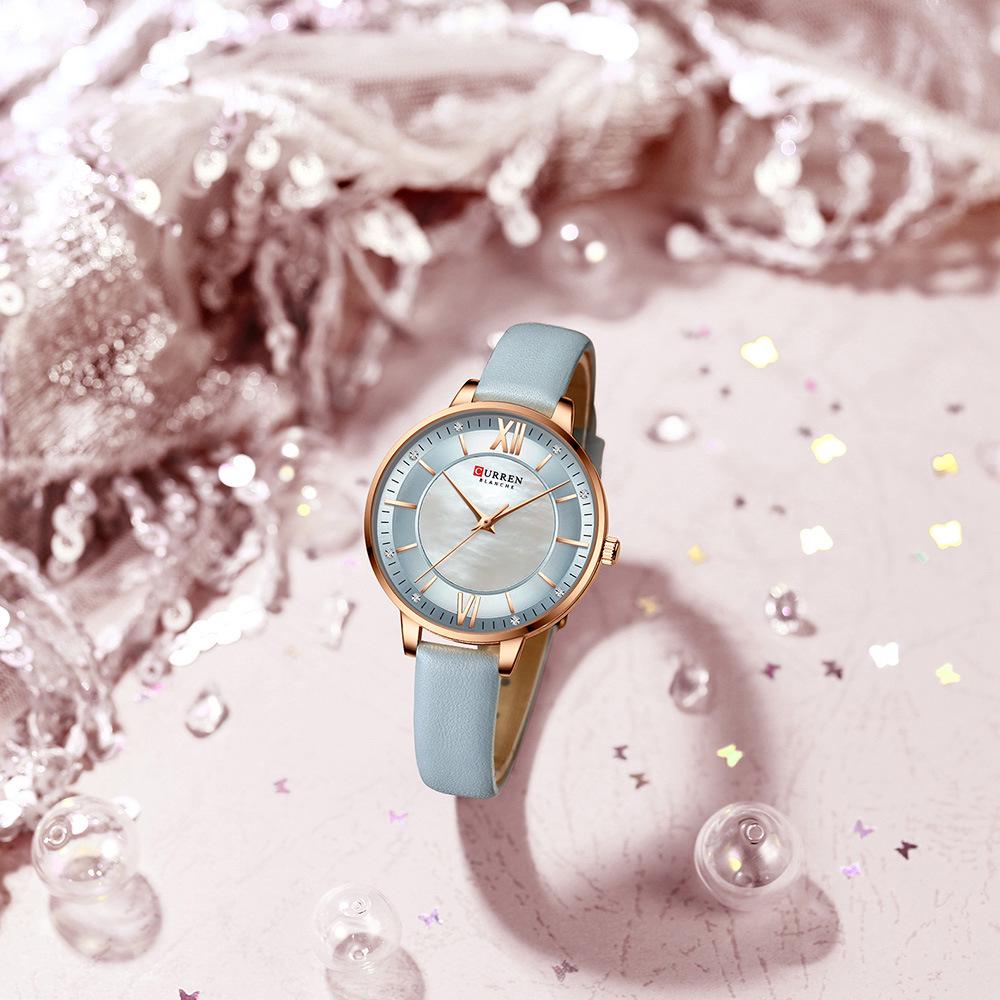 CURREN 9080 Женские ультратонкие водонепроницаемые часы с перламутровым циферблатом и кожаным ремешком