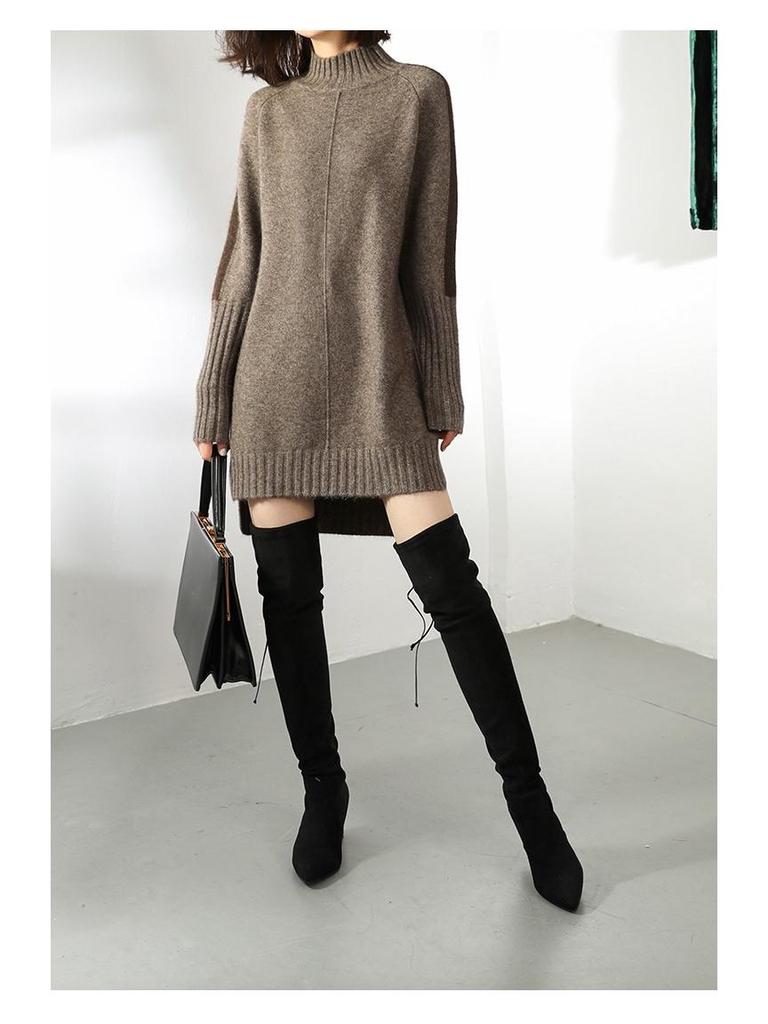 Женское трикотажное шерстяное платье-свитер средней длины с полувысоким воротником и разрезом – Модное и свободное для осени и зимы.
