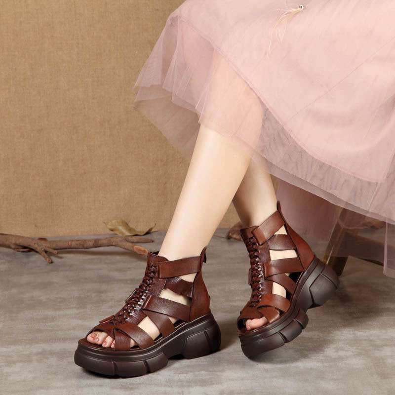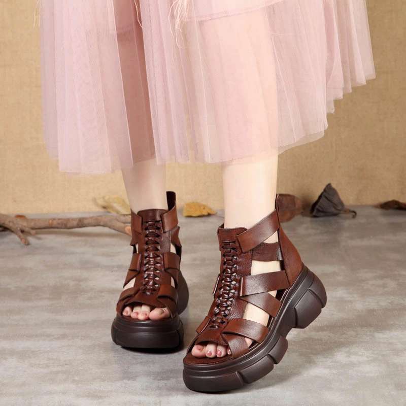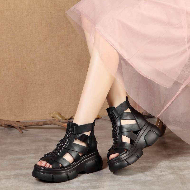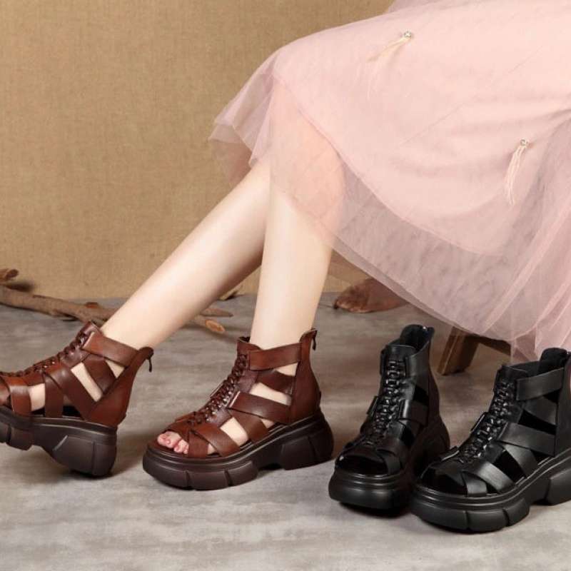 Летние новые ретро сапоги ручной работы из толстой кожи на платформе, женские сандалии на высоком каблуке, с вырезами, из мягкой кожи, на танкетке, с открытым носком, римские