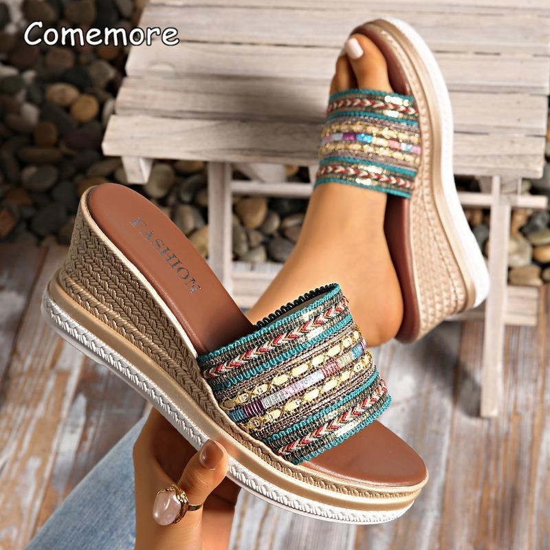 Модные богемные полосатые плетеные сандалии на танкетке, женские летние шлепанцы на толстой подошве для улицы и пляжа, женские больших размеров 43, модные шлепанцы на платформе