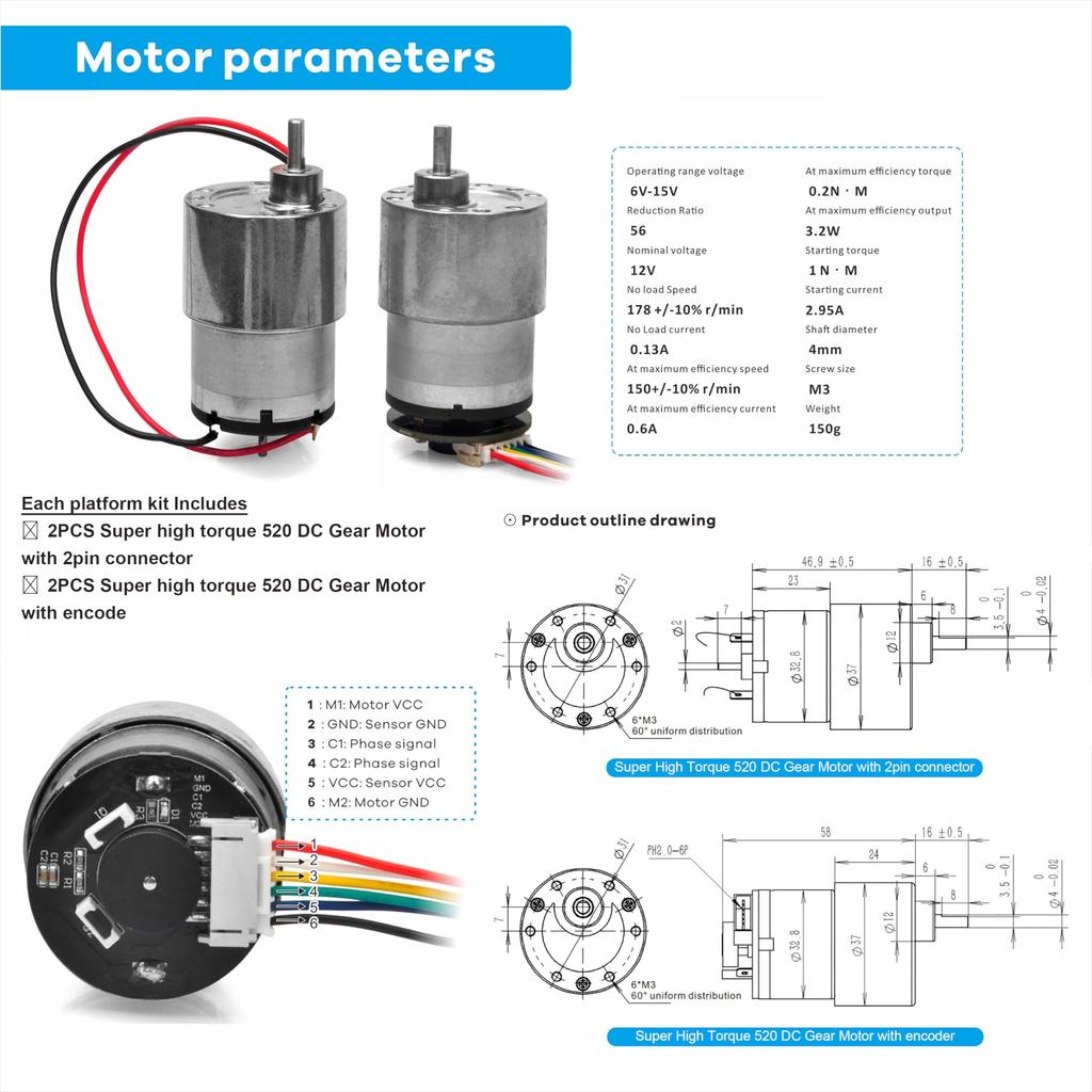 Высокопроизводительные двигатели 520 с энкодерами для точного управления. В комплект входят четыре мощных двигателя 520, два из которых оснащены энкодерами для точного управления скоростью и направлением.. Это обеспечивает плавное движение и высокую точность, что делает их идеальными для передовых робототехнических задач, требующих точного управления двигателем.