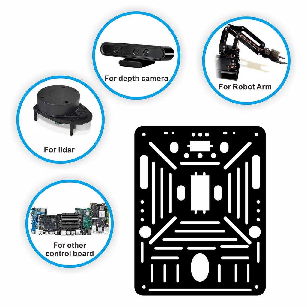 Шасси робота FlexiRover оснащено многочисленными монтажными отверстиями, что позволяет легко крепить различные датчики, механические руки, экраны и даже камеры глубины.. Эта конструкция дает разработчикам гибкость для расширения робота в соответствии с потребностями их проекта.
