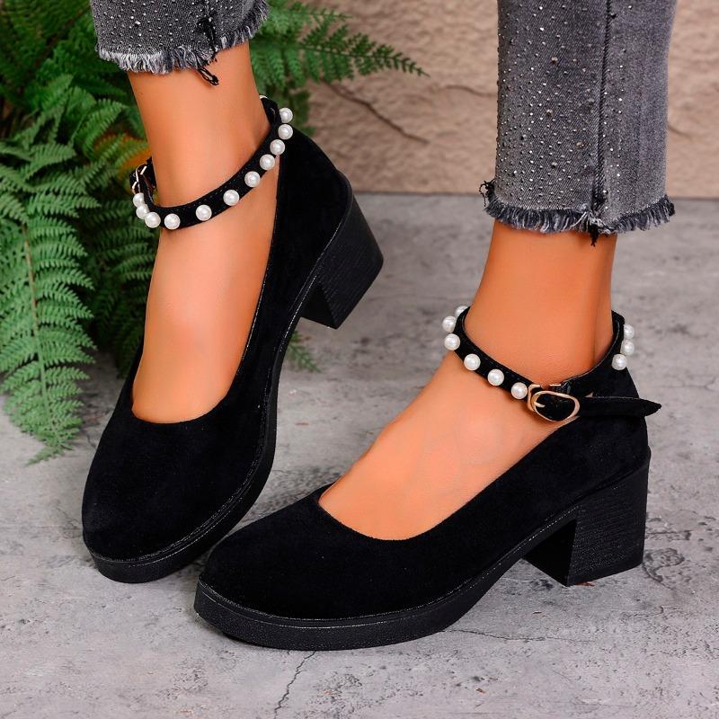 Мода 2025 Женские туфли-лодочки Мэри Джейн больших размеров на высоком каблуке, с круглым носком, ремешком с пряжкой и бусинами, на толстом каблуке, для ретро-офиса и карьеры