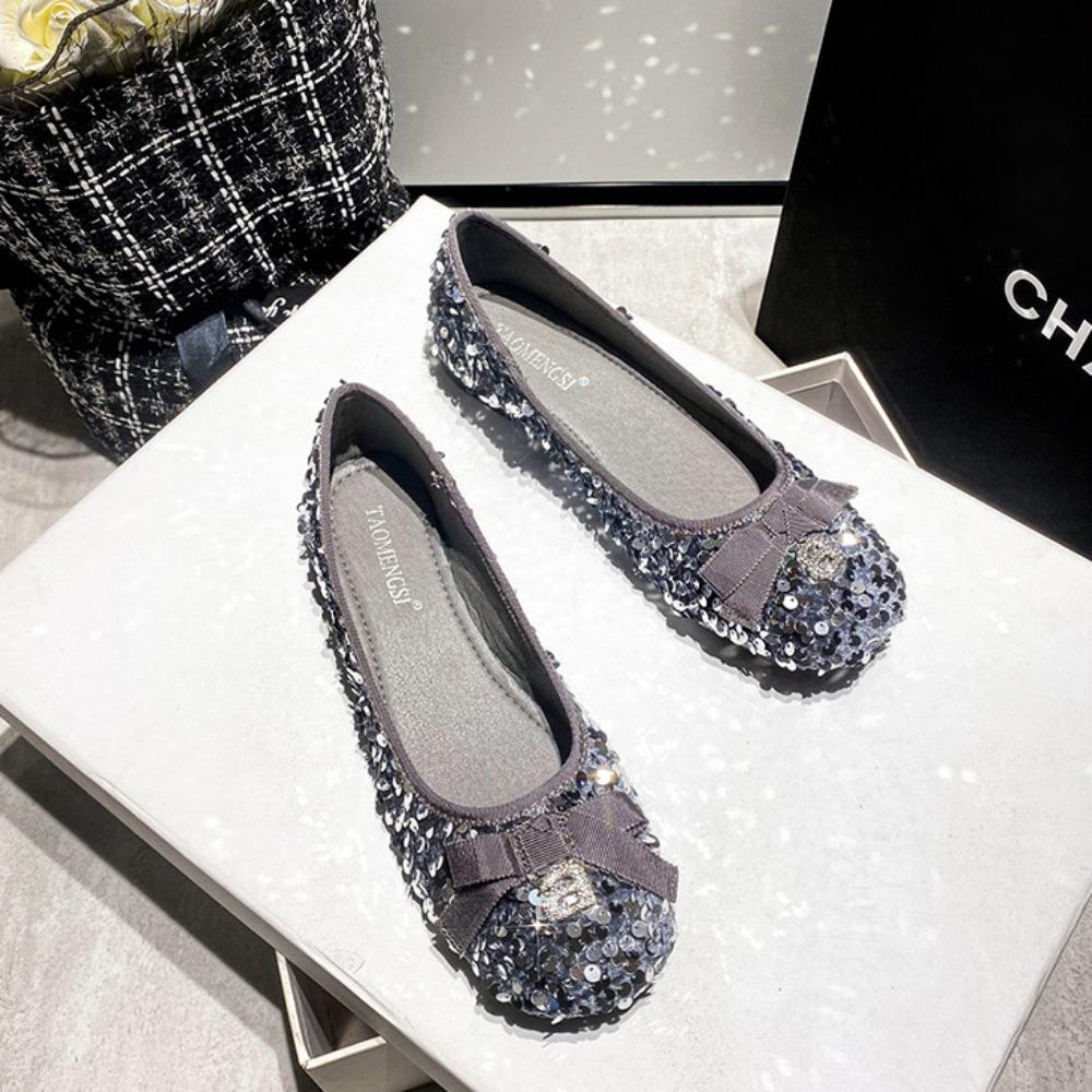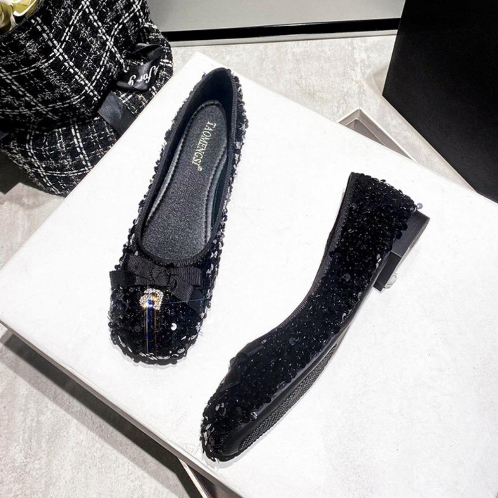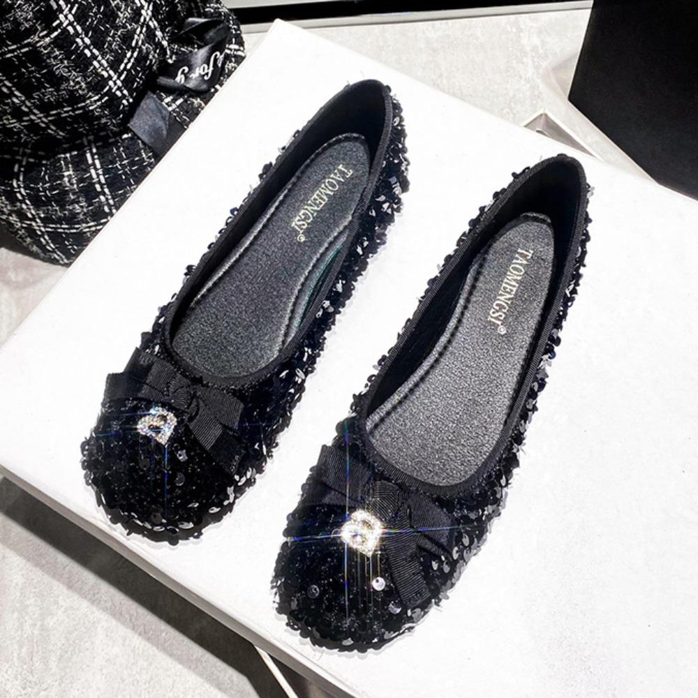 Модная женская обувь на плоской подошве, туфли-лодочки с неглубоким вырезом, блестящие туфли с бантом из пайеток, темпераментные туфли-одинарки, женские балетки, женская обувь, мода