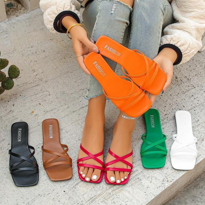 Модные оранжевые сандалии на плоской подошве для женщин, кожаные, роскошные, повседневные, летние, нескользящие шлепанцы, женские, с открытым носком, квадратным носком, для улицы, пляжные шлепанцы