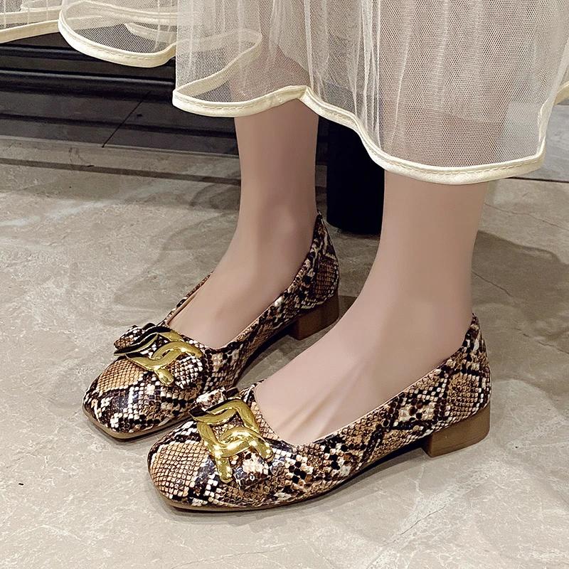 Мода 2025 Лето Женские Туфли с принтом змеи Квадратный носок Слипоны Женские Туфли на высоком каблуке Металлическая отделка Модные туфли-лодочки для офиса Обувь больших размеров