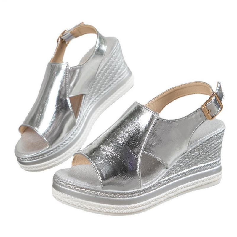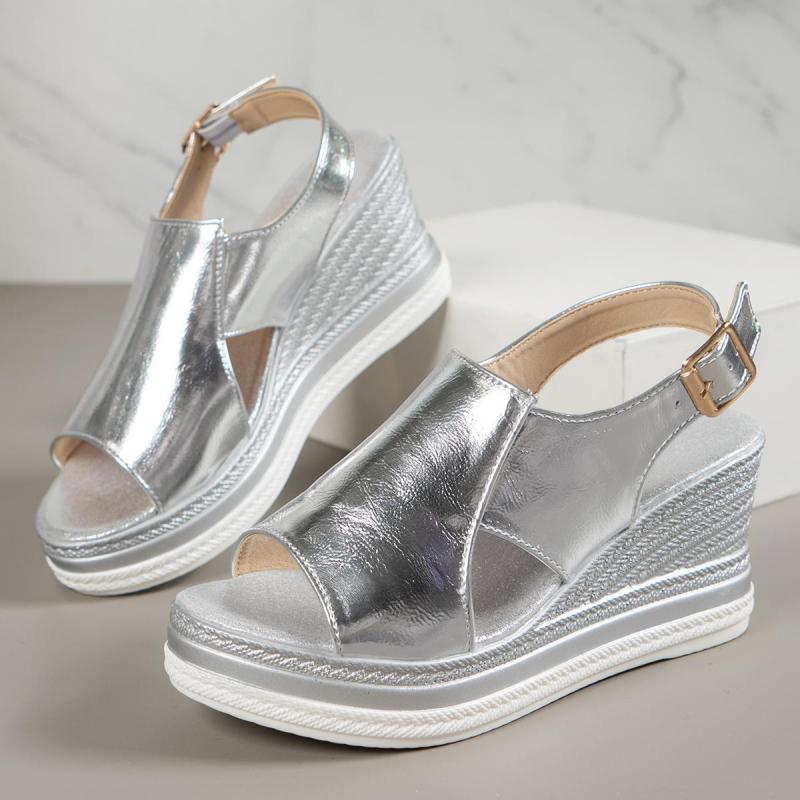 Модные серебристые сандалии на танкетке, кожаная летняя обувь на высоком каблуке, сандалии на платформе с пряжкой, женские сандалии на толстой подошве для улицы, с открытым носком, 2025