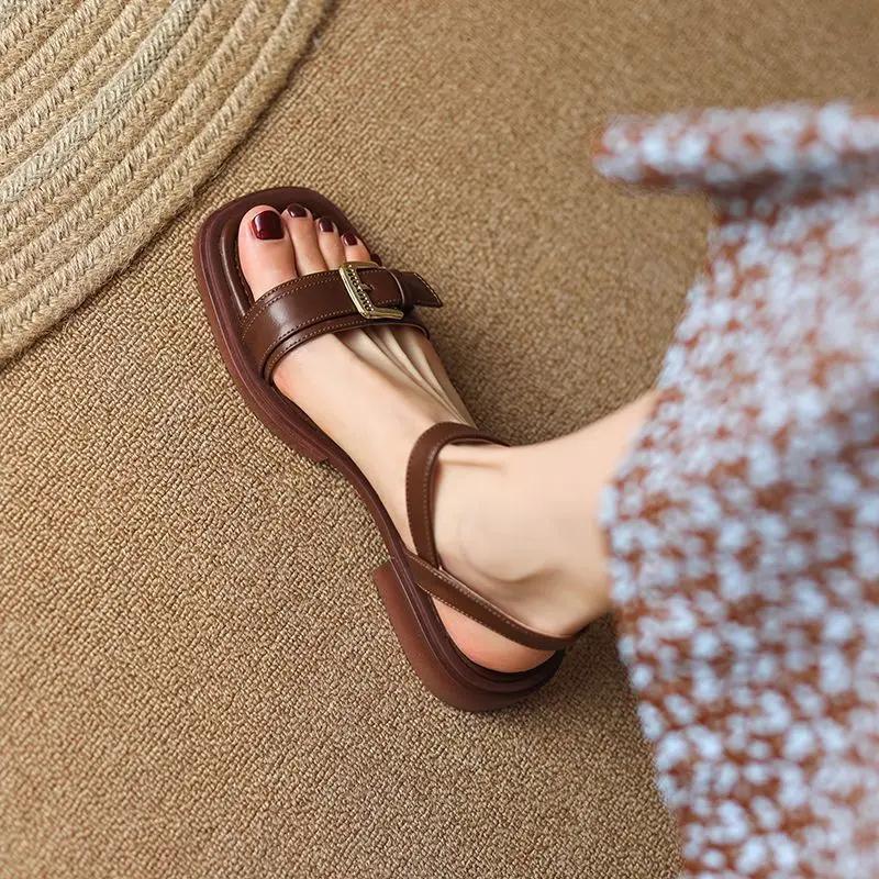 Модные плоские кожаные сандалии с пряжками «Одно слово» Лето 2024 для женщин Обувь с открытым носком на низком каблуке Женская обувь Молодежная Распродажа Предложение H