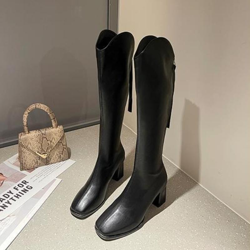 Модные женские теплые элегантные длинные сапоги на каблуке с квадратным носком, дизайнерские, роскошные, готические, из ПУ, для косплея, водонепроницаемые, горячие, с высоким голенищем до колена