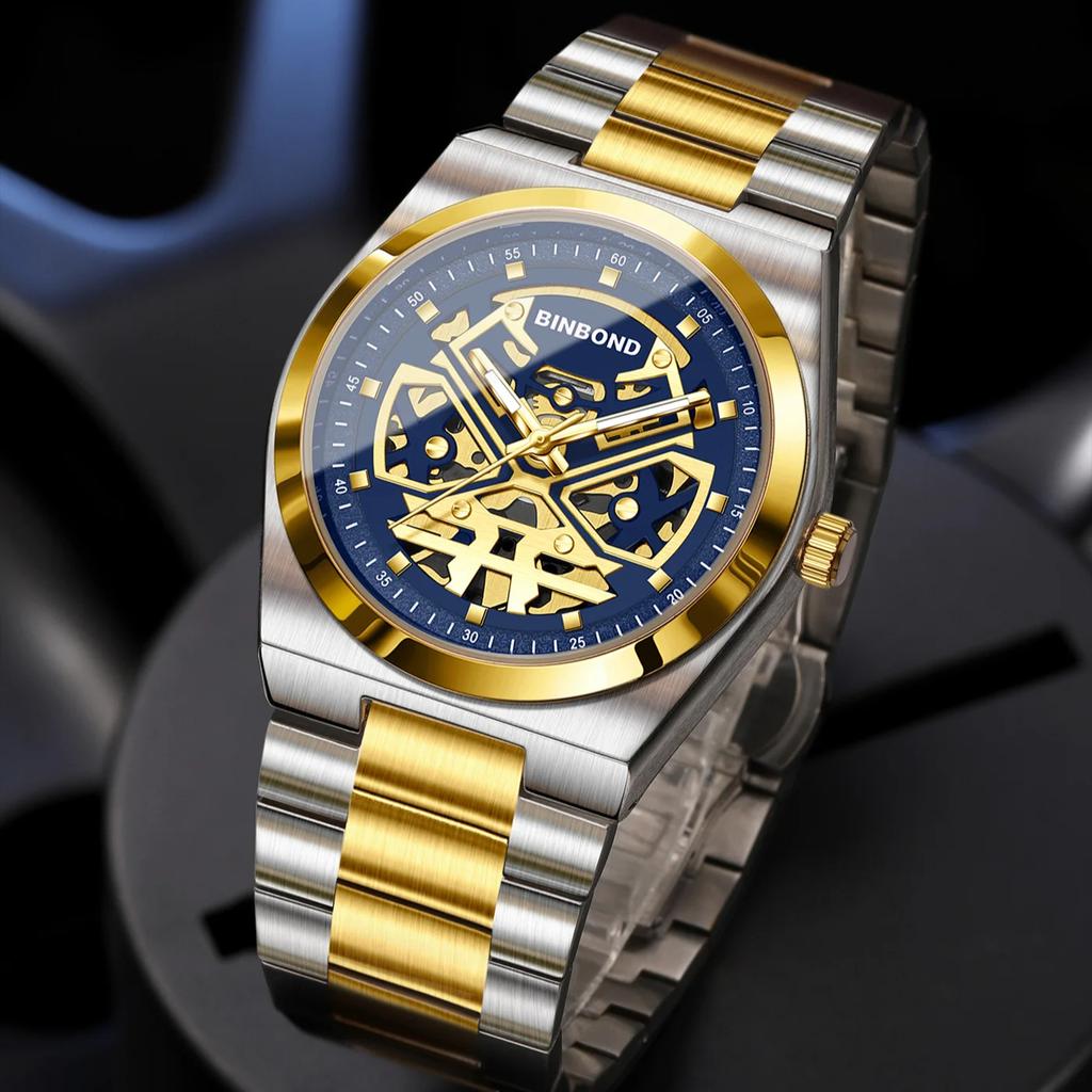 BINBOND Брендовые скелетонизированные модные часы мужские роскошные спортивные часы высококлассные роскошные водонепроницаемые ночные мужские кварцевые часы