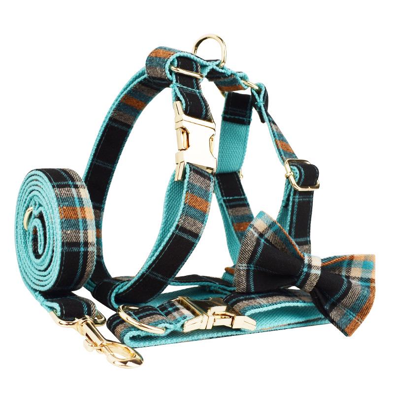 Зеленый бархатный клетчатый ретро набор ошейника, поводка и шлейки для питомца с бантом