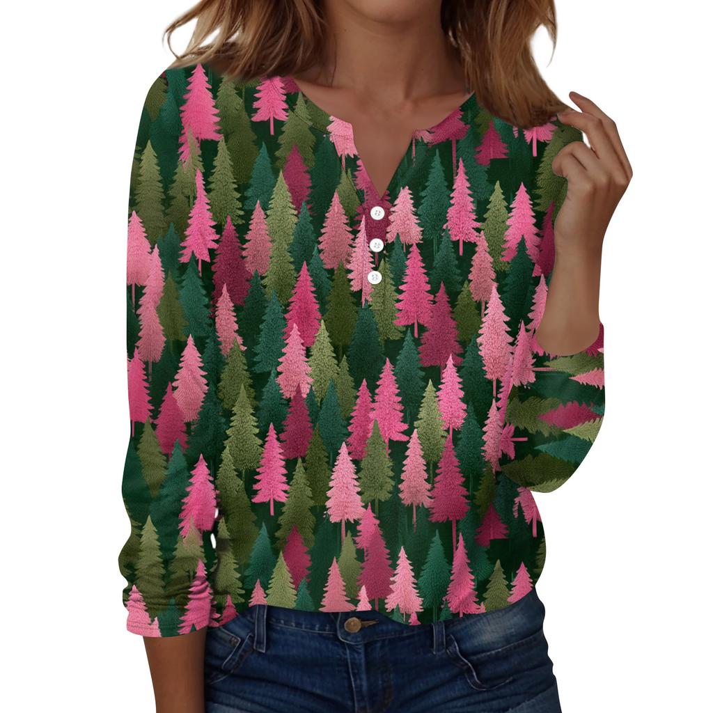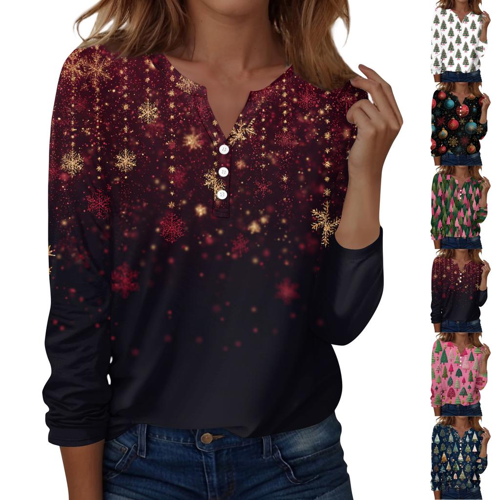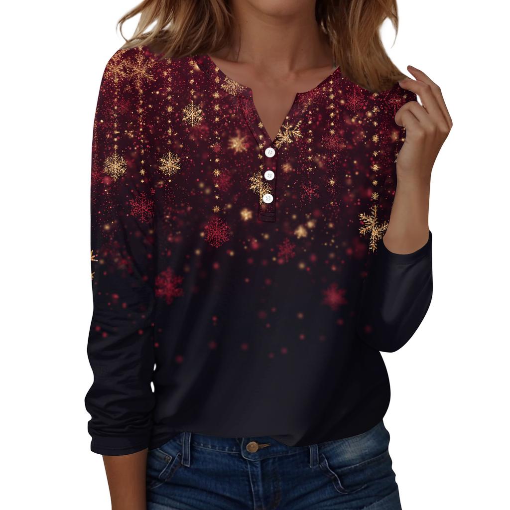 Женская мода Повседневная футболка с V-образным вырезом, длинными рукавами и декоративными пуговицами