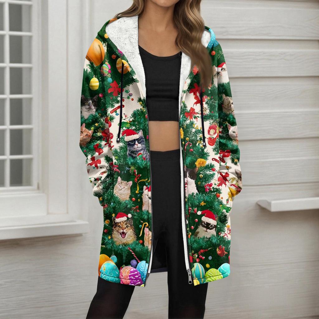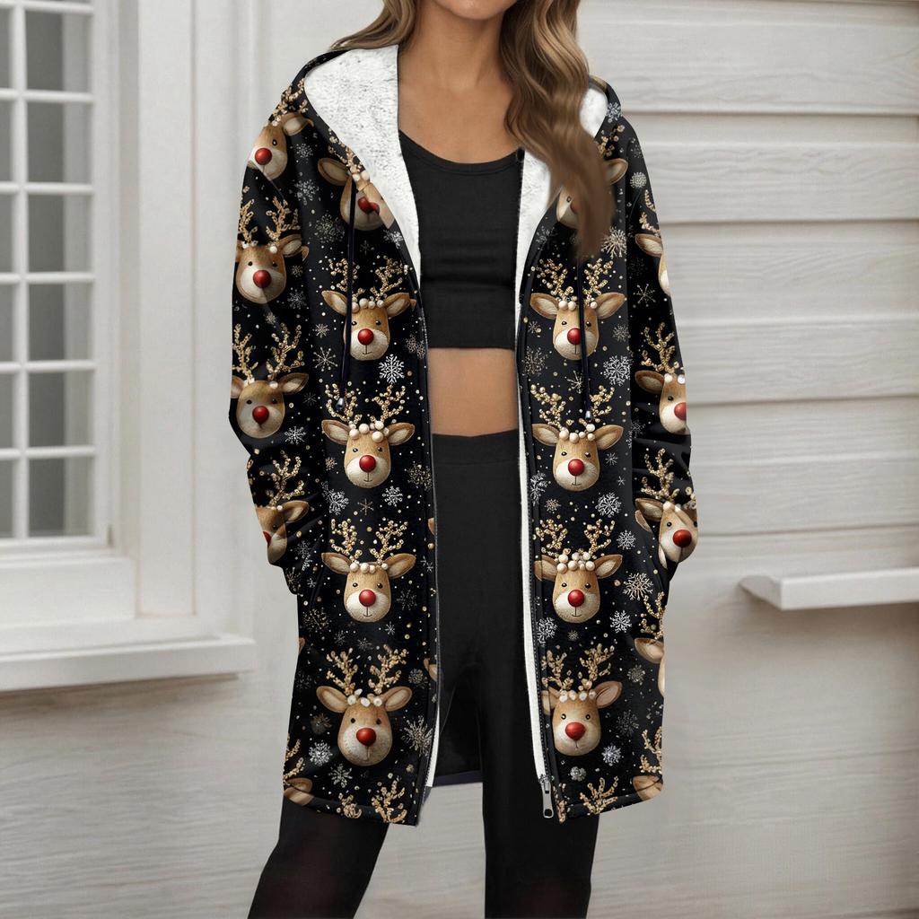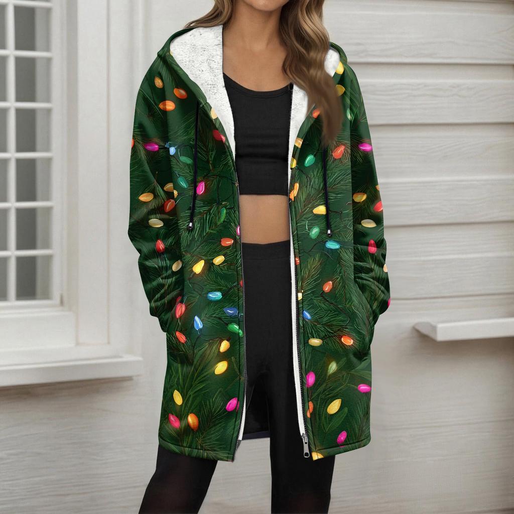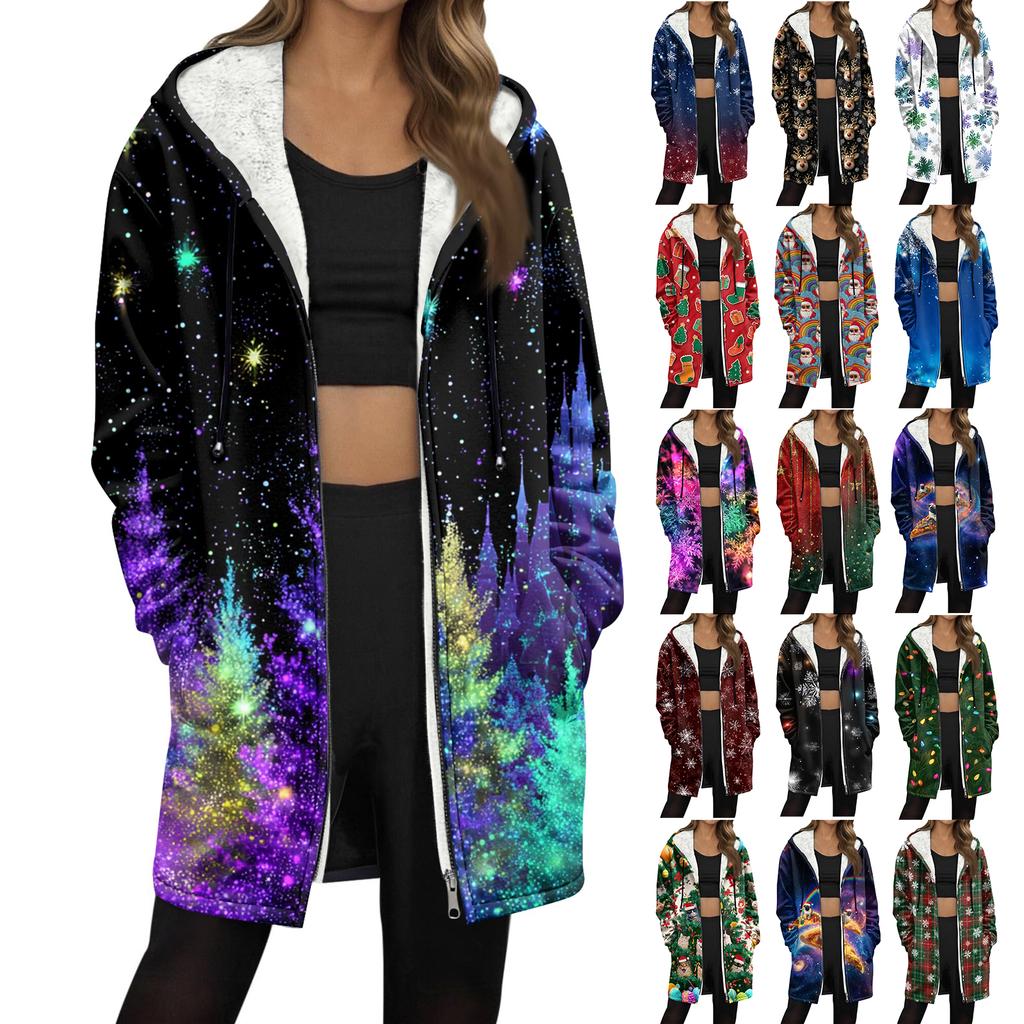 Женская модная флисовая куртка-худи на молнии свободного кроя с рождественским принтом