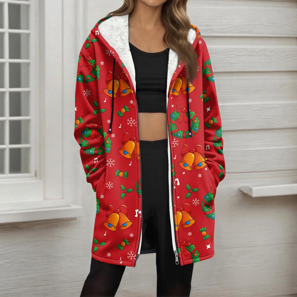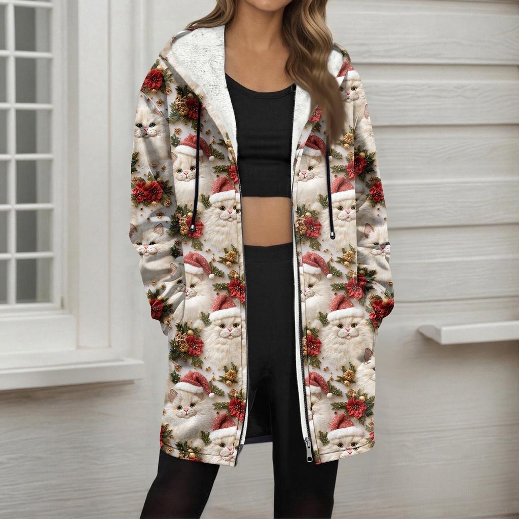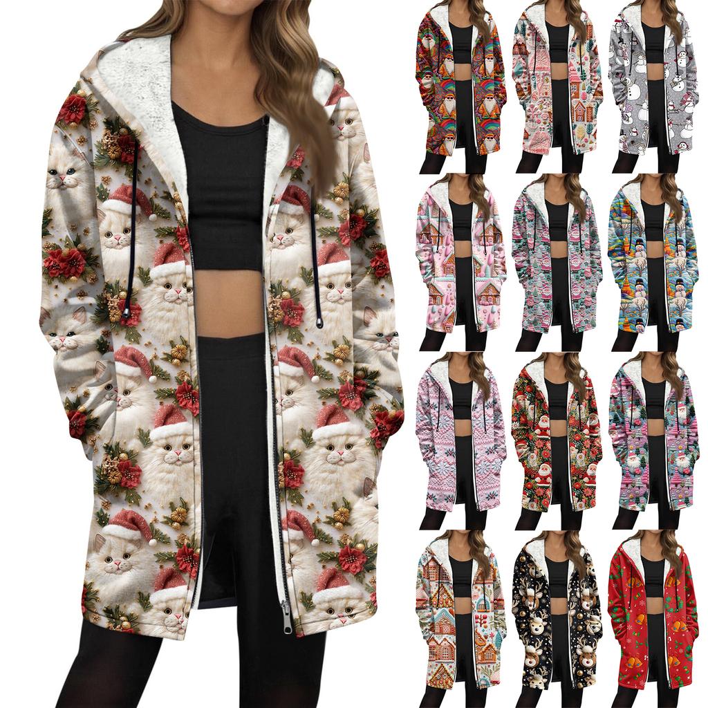 Женская модная флисовая куртка-худи на молнии свободного кроя с рождественским принтом