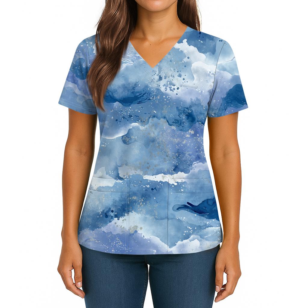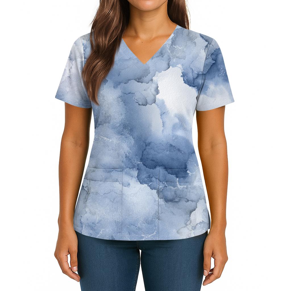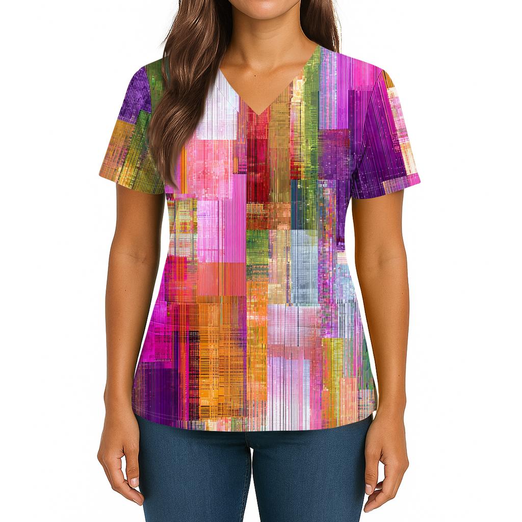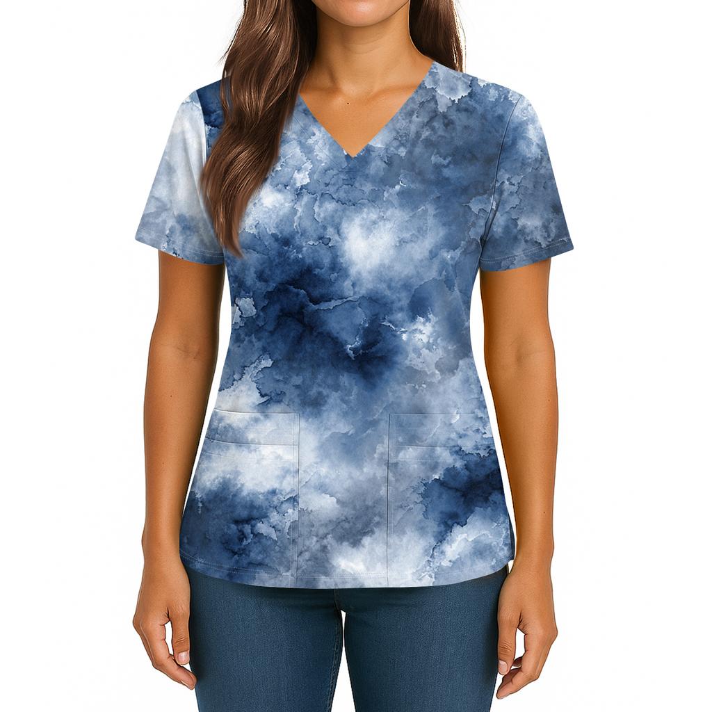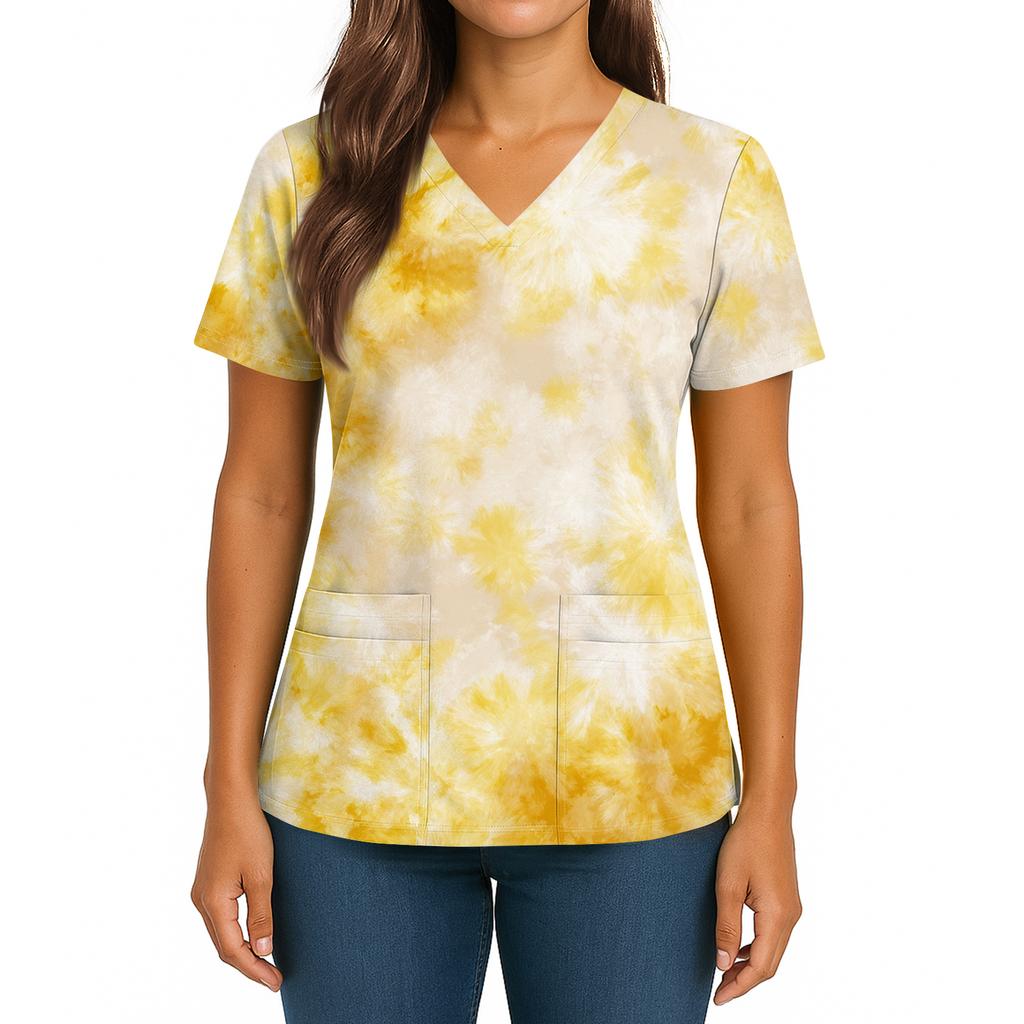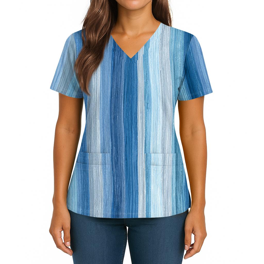 Женский топ с градиентным принтом, V-образным вырезом, двойным карманом, короткими рукавами, разрезом по низу, униформа для ухода