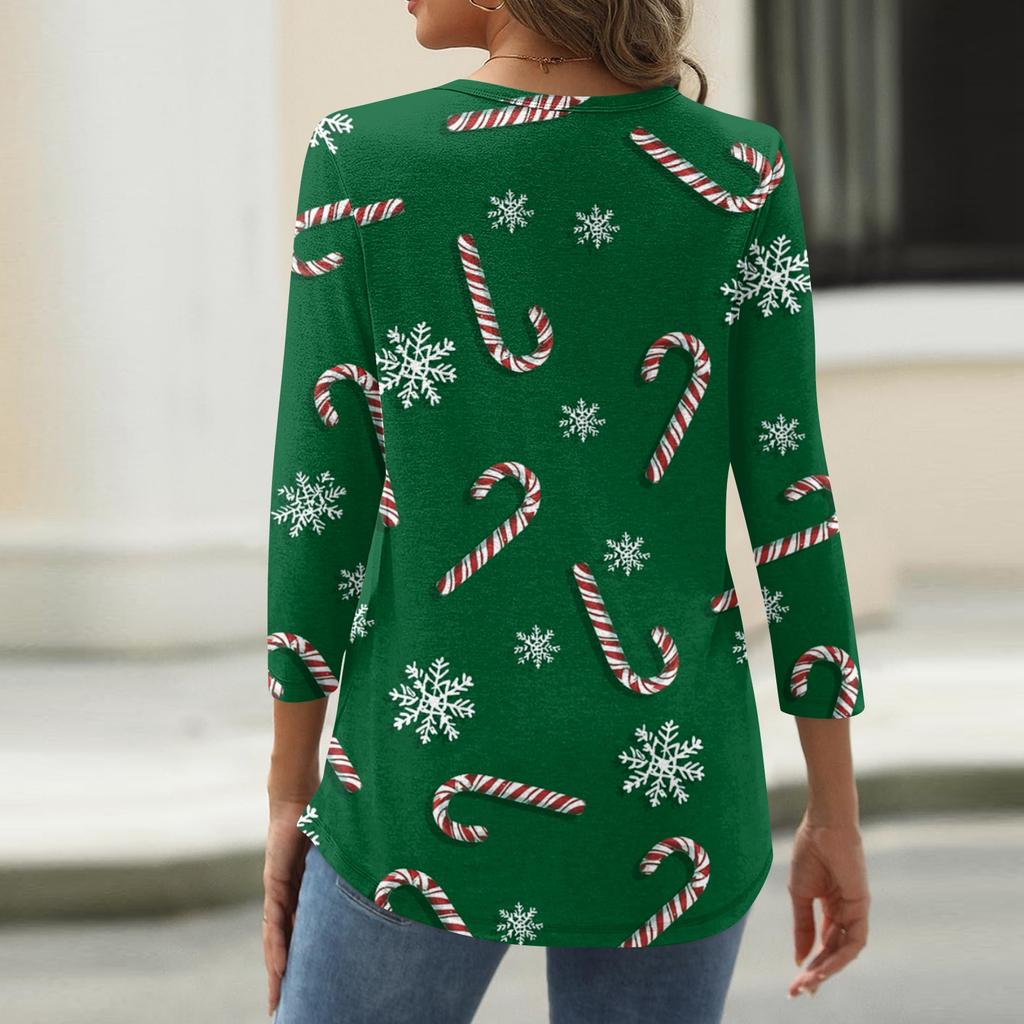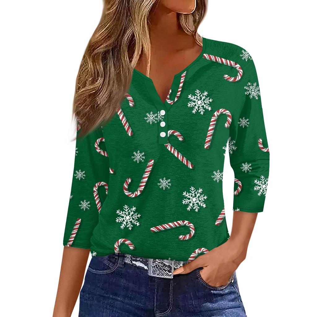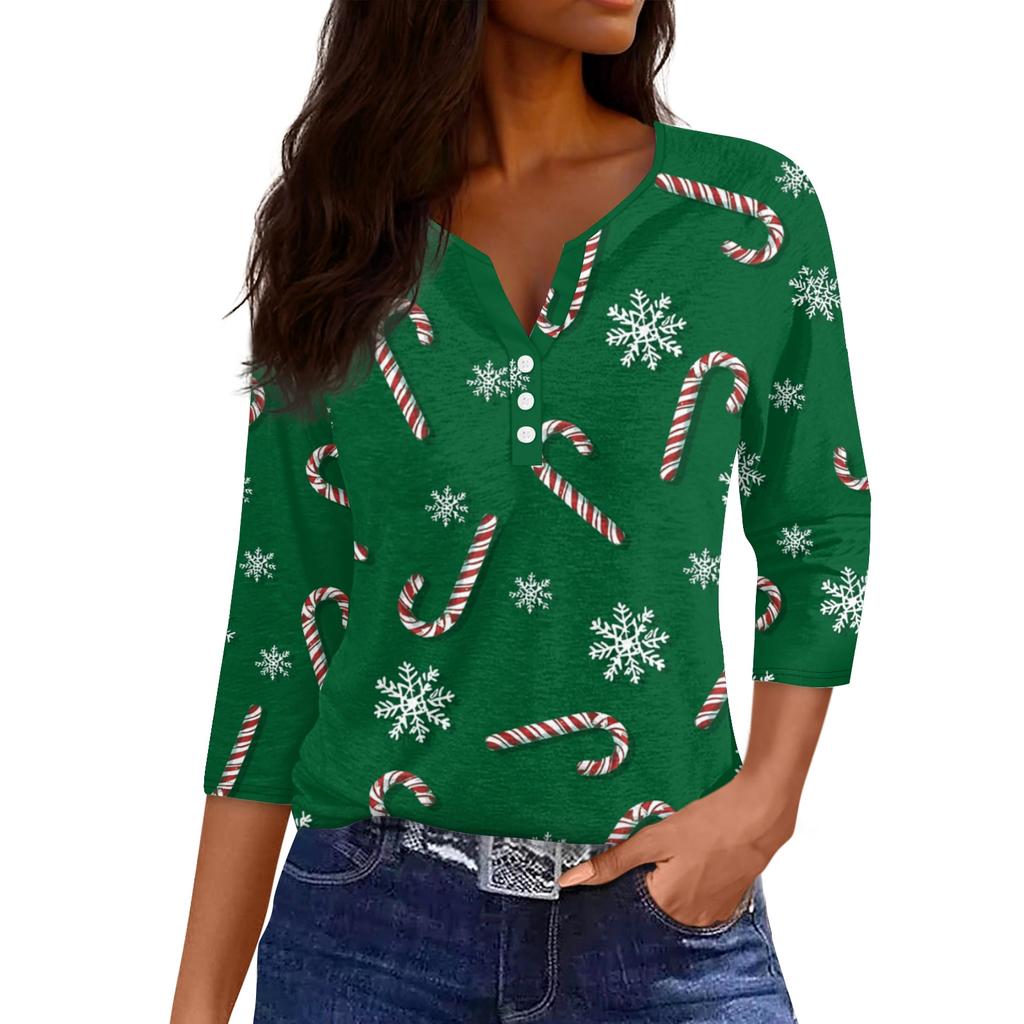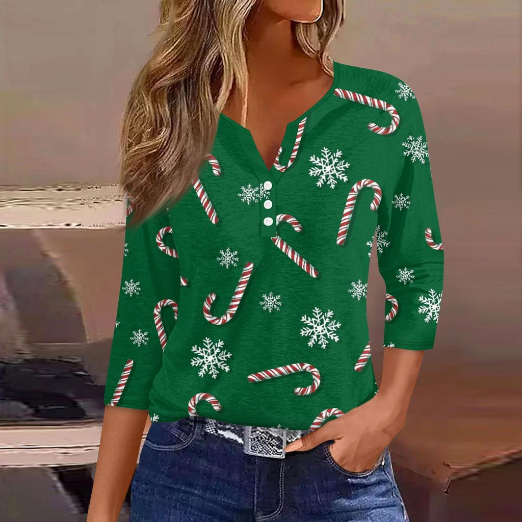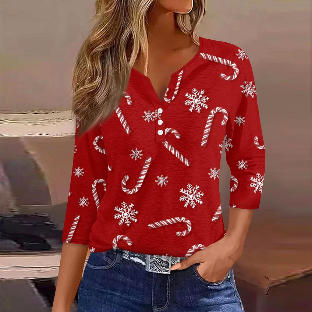 Женская модная повседневная рождественская блузка с V-образным вырезом и рукавом три четверти, украшенная пуговицами