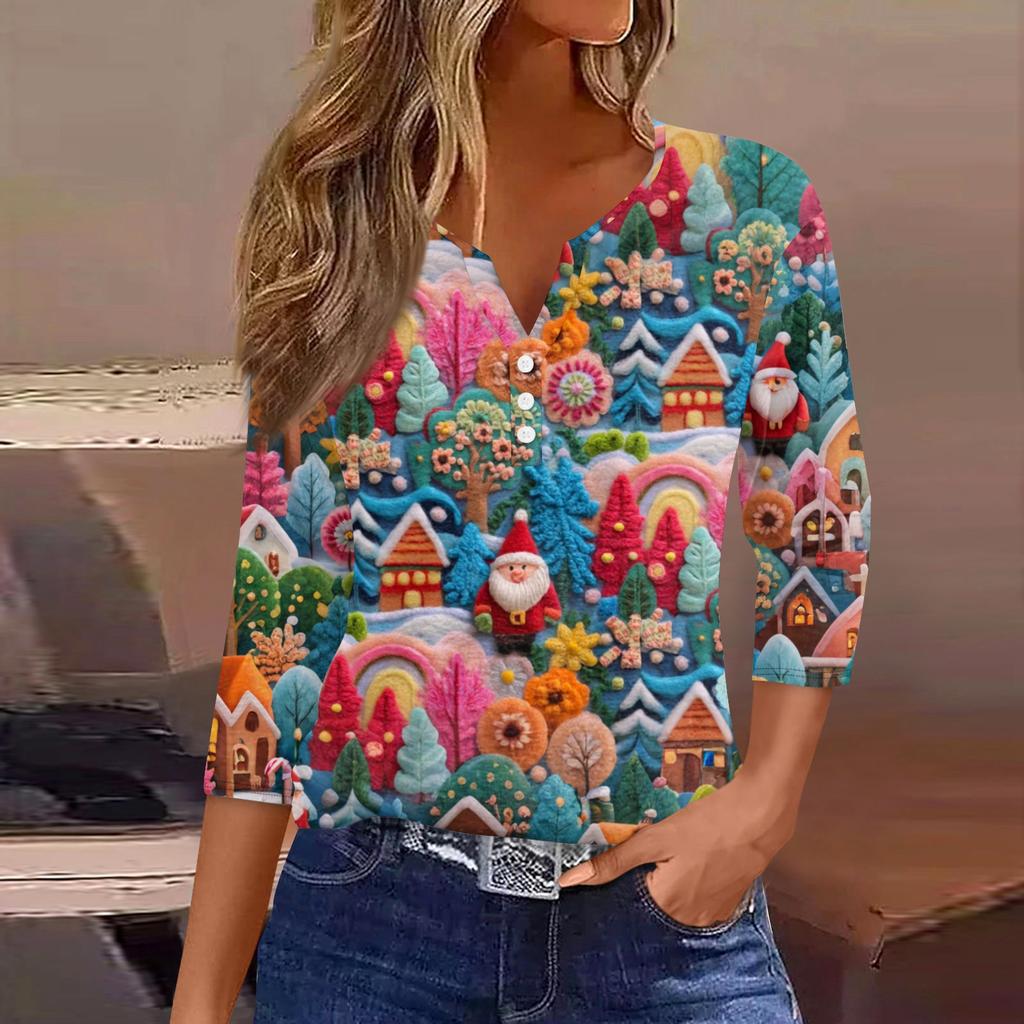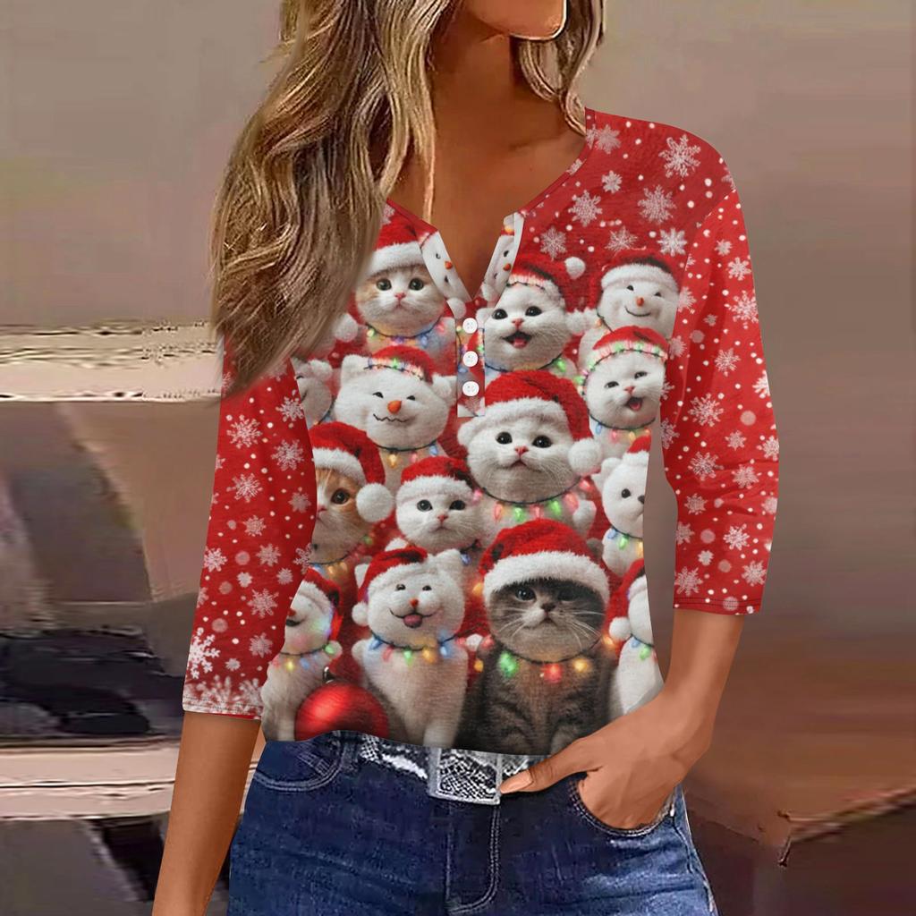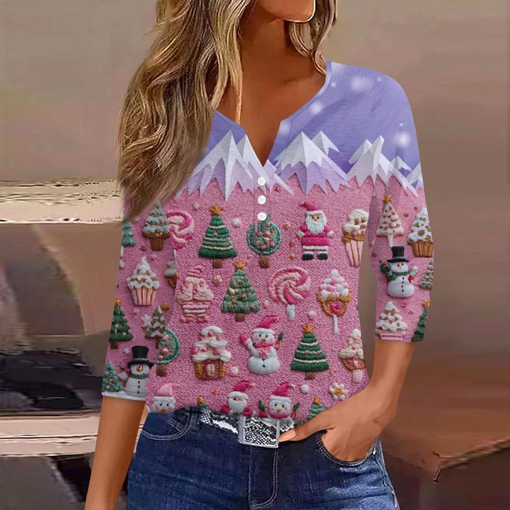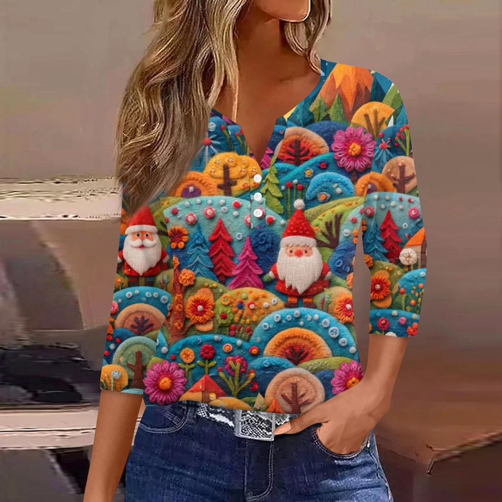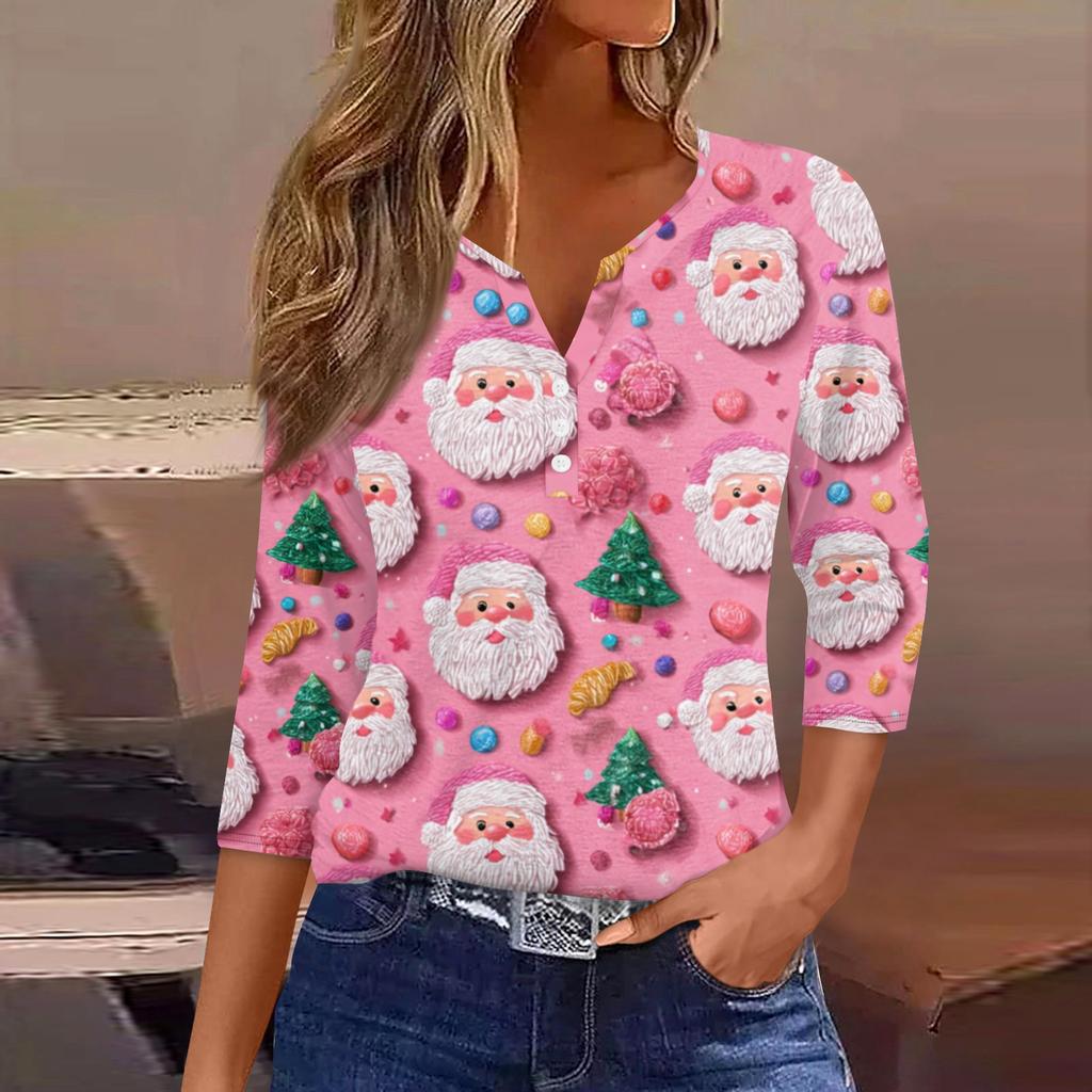 Женская модная повседневная рождественская блузка с V-образным вырезом и рукавом три четверти, украшенная пуговицами