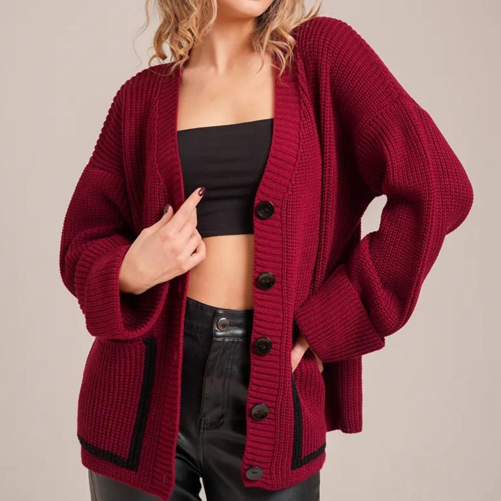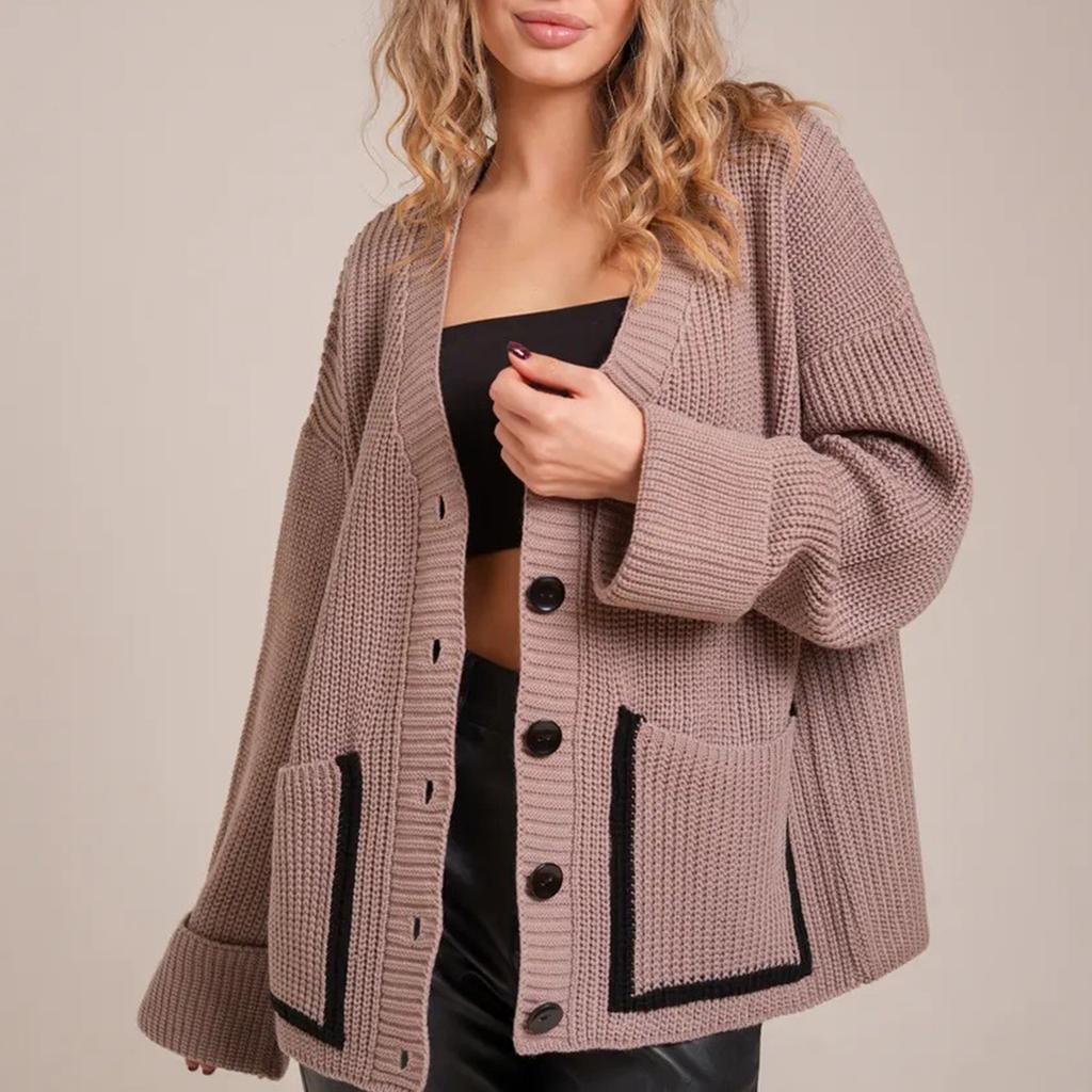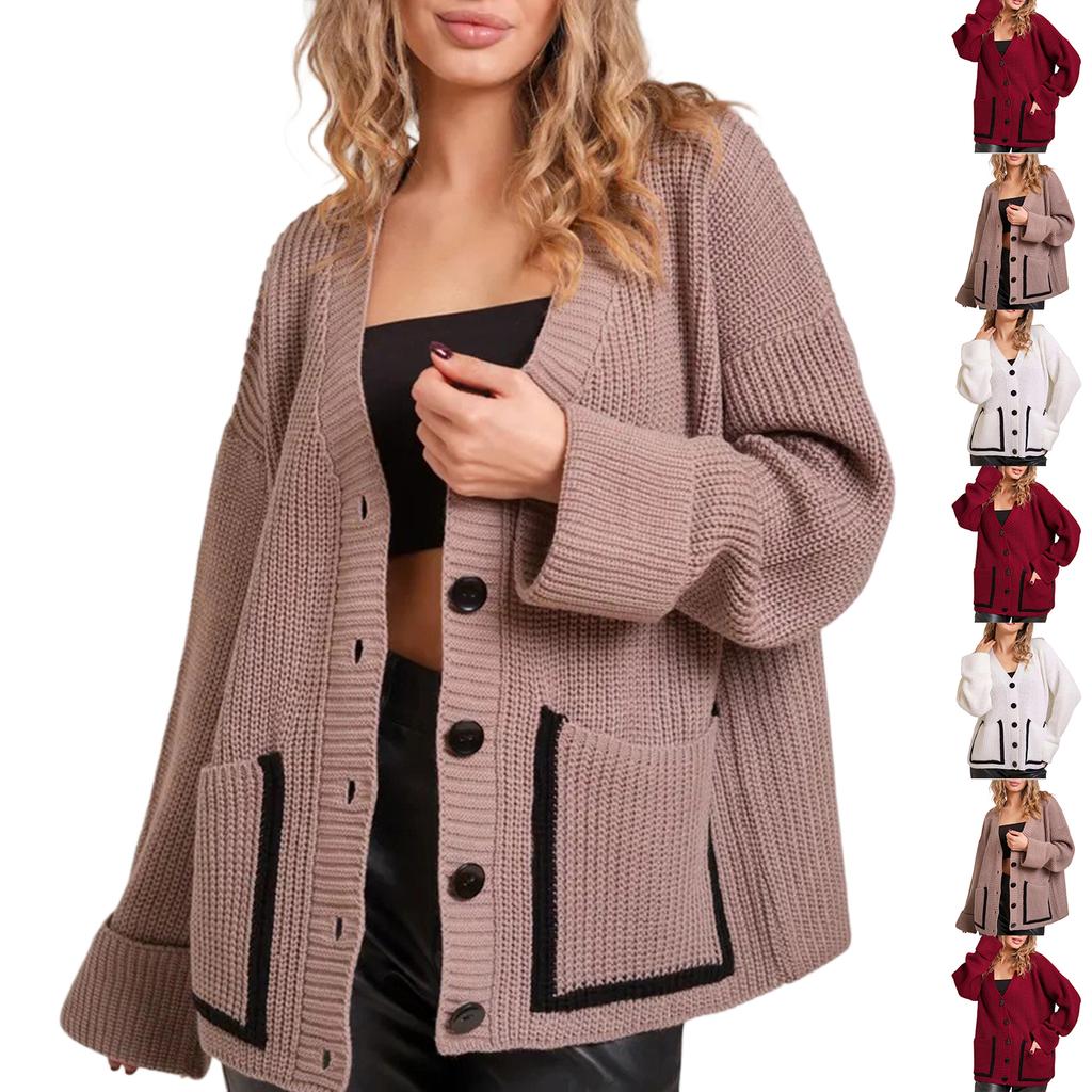 Женский модный повседневный кардиган контрастного цвета, вязаный, с V-образным вырезом, куртка с длинными рукавами