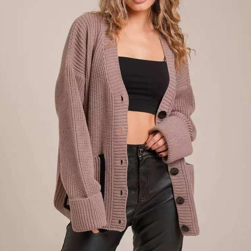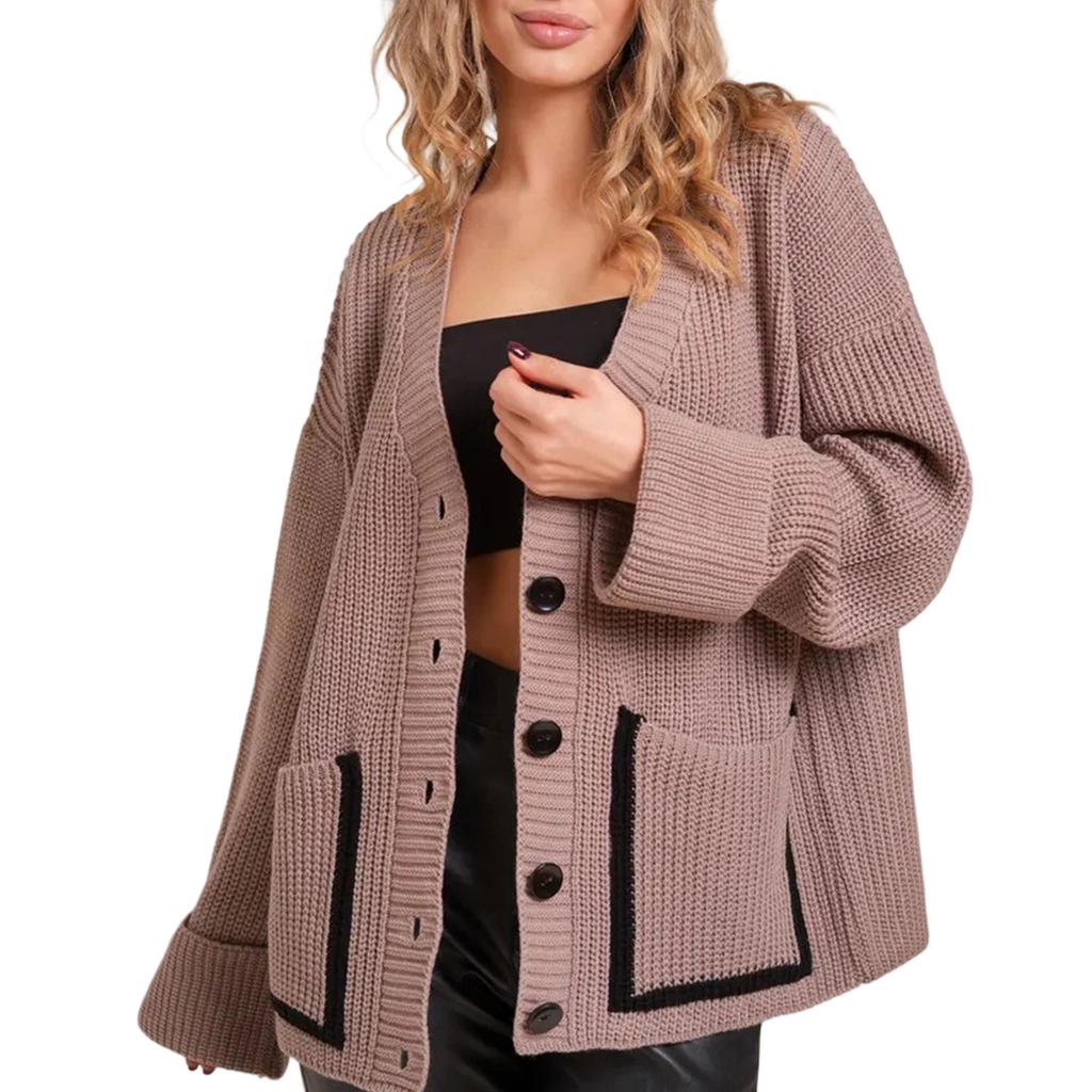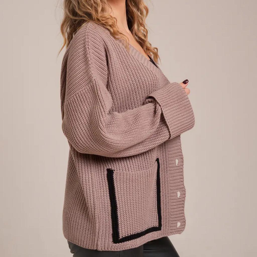 Женский модный повседневный кардиган контрастного цвета, вязаный, с V-образным вырезом, куртка с длинными рукавами