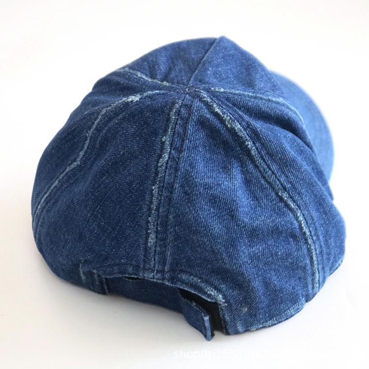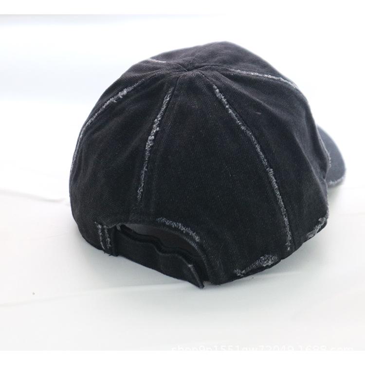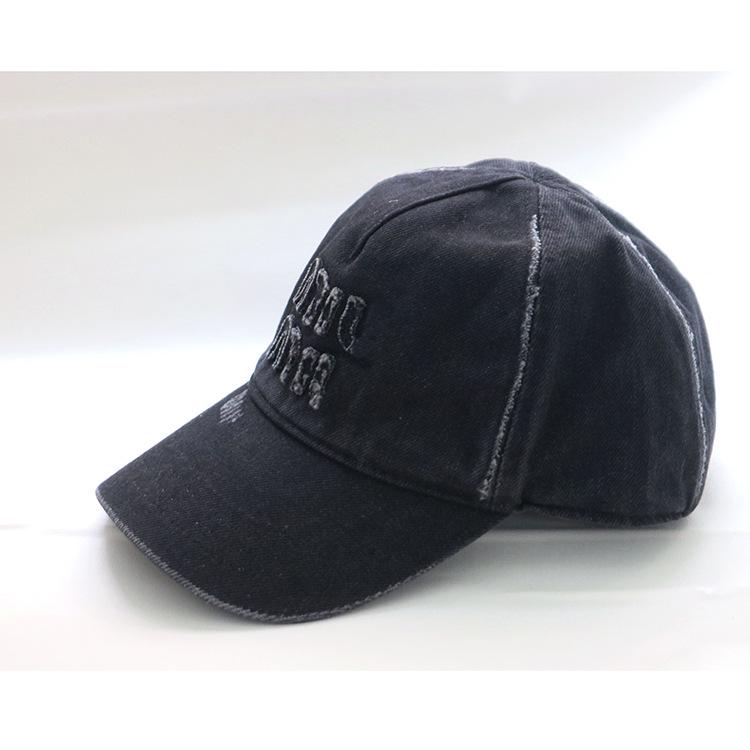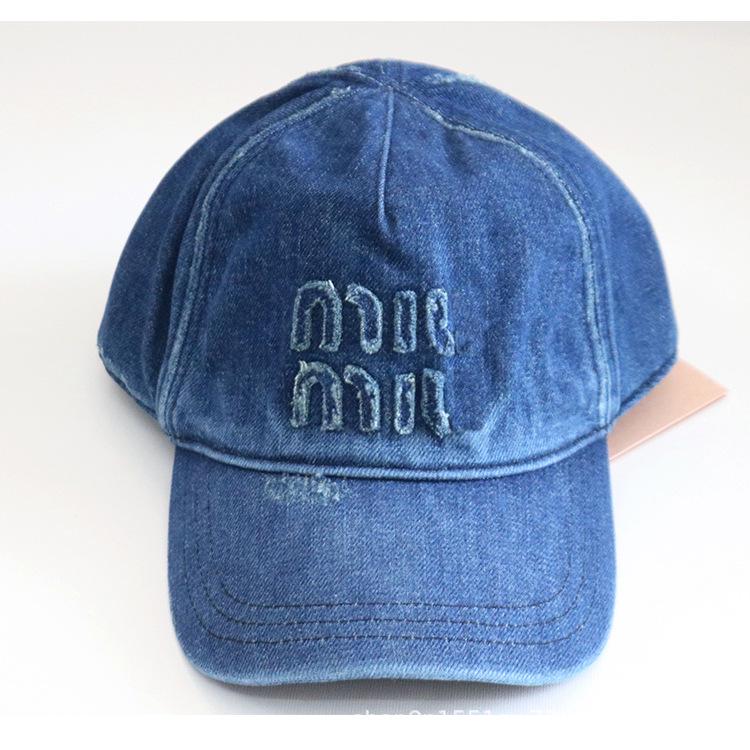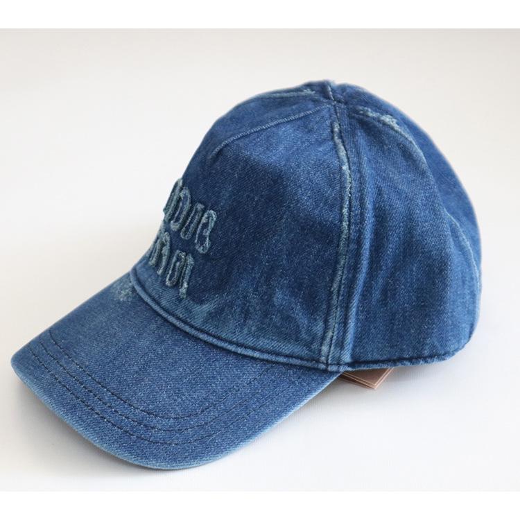 Женская шапка Miu: Бейсболка из денима с аппликацией и вышивкой Весна/Лето 2025 - Вываренный, рваный дизайн.