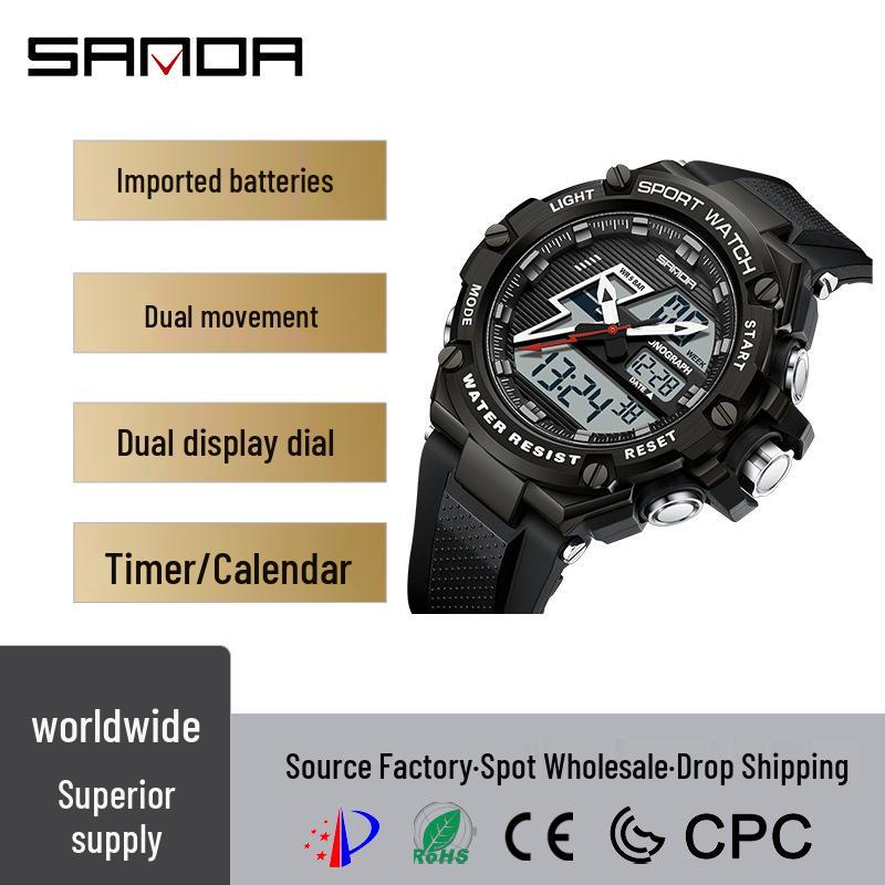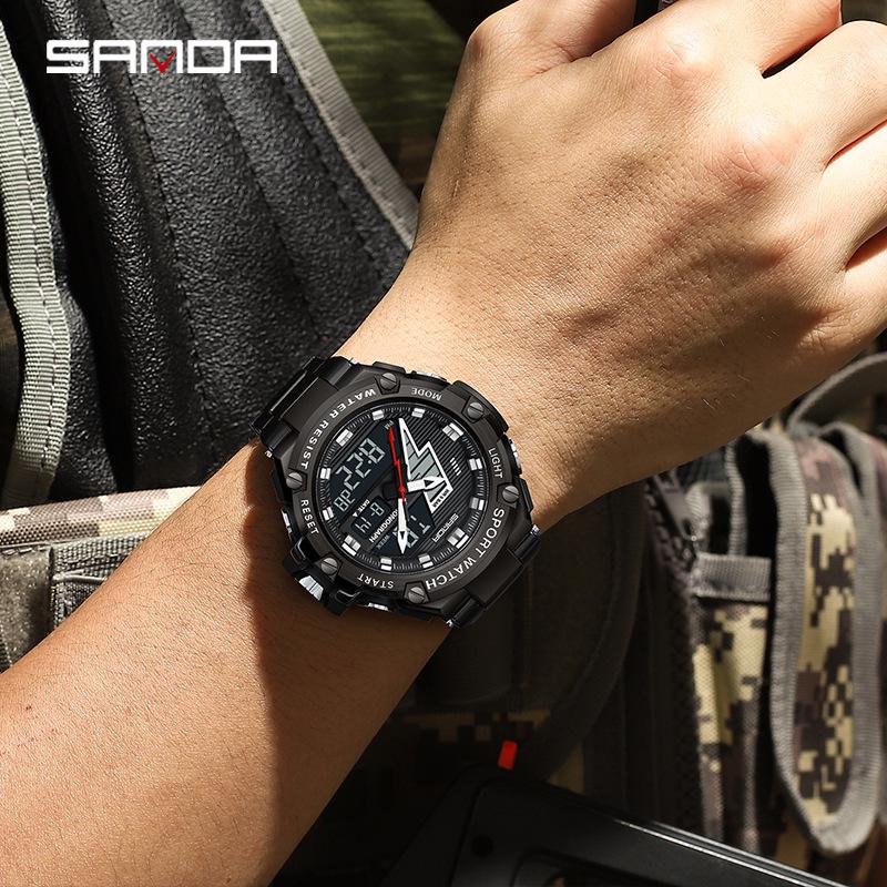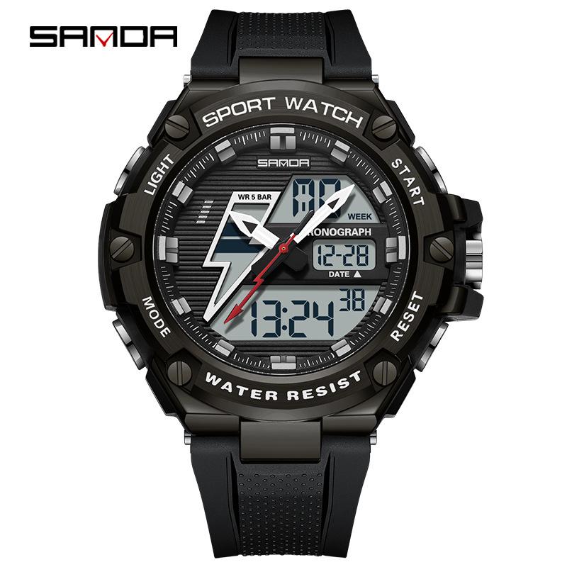 Мужские многофункциональные противоударные водонепроницаемые спортивные часы Sanda с будильником и черными технологиями.
