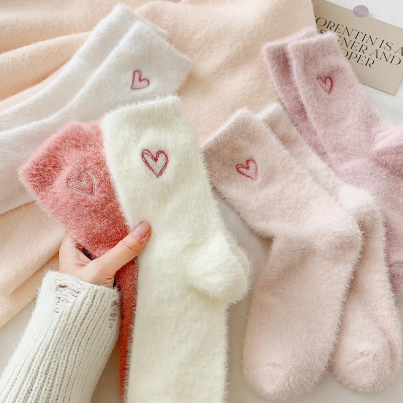 Женские осенне-зимние теплые носки для сна из норкового бархата с вышивкой в виде сердца