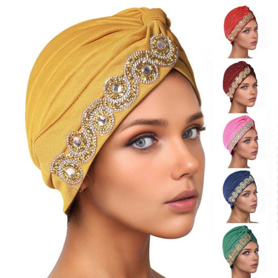 Элегантный платок-шапка: Подчеркните свой стиль нашей изысканной шапкой-платком, изготовленной из высококачественной полиэстеровой ткани.. Скрученный и плиссированный дизайн, украшенный стразами, добавляет нотку изысканности и элегантности любому наряду.