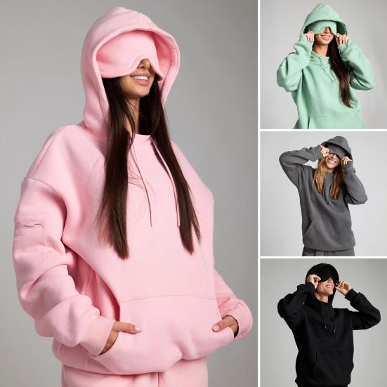 Легкая и регулируемая конструкция: Скажите «прощай» громоздким маскам для сна! Это худи оснащено легкой и регулируемой маской для глаз, которая надежно фиксируется на месте, что подходит как для спящих на боку, так и для путешественников, страдающих бессонницей.