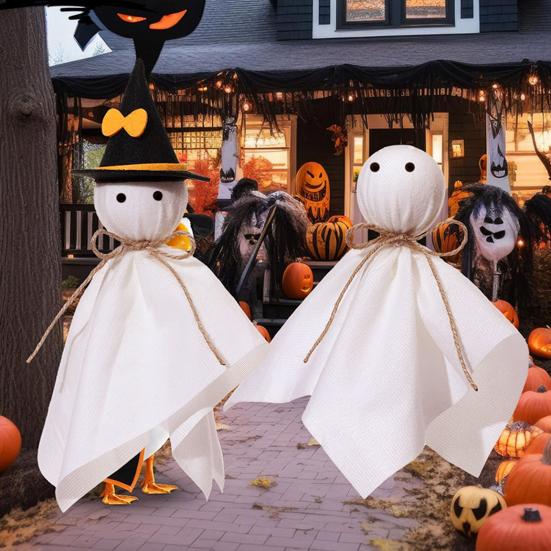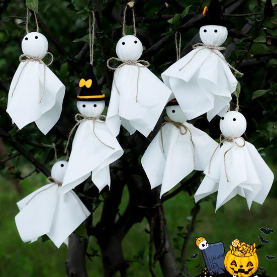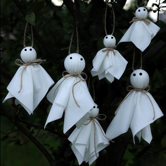 Очаровательный дизайн: Эти украшения, изготовленные из белой ткани с черными глазами и пеньковой веревкой, имеют очаровательную форму привидения.. Наблюдайте, как они причудливо танцуют на ветру, создавая неподвластную времени и чарующую атмосферу Хэллоуина.