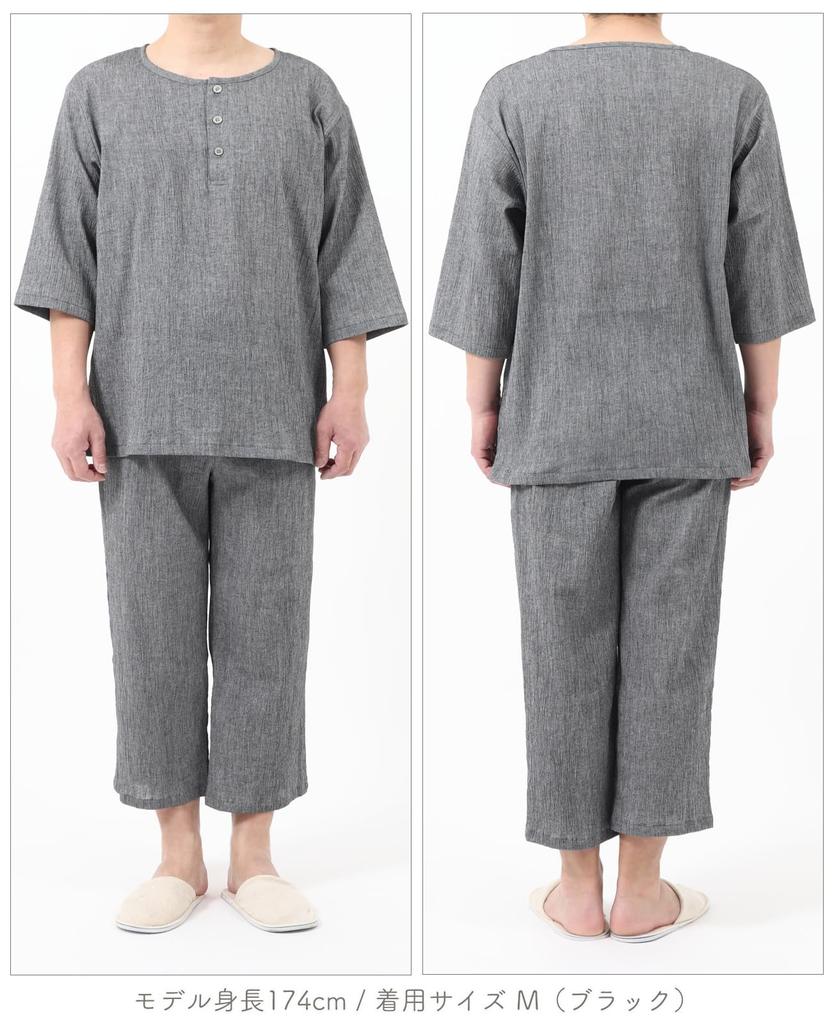 [Тип с воротником хенли] Размер M [Верх] Длина/71.5 Обхват груди/120 Ширина плеч/50 Длина рукава/39 [Брюки] Длина брюк/88 Посадка/30 Длина по внутреннему шву/58 Обхват талии/60
