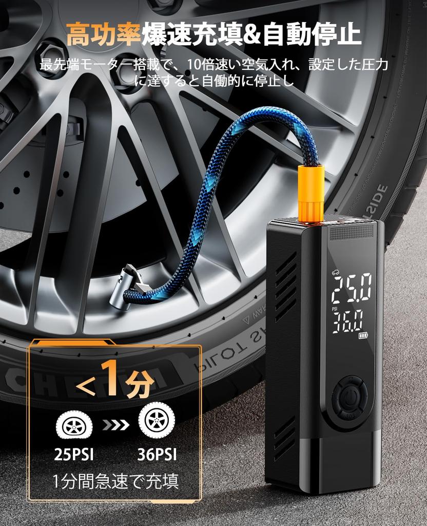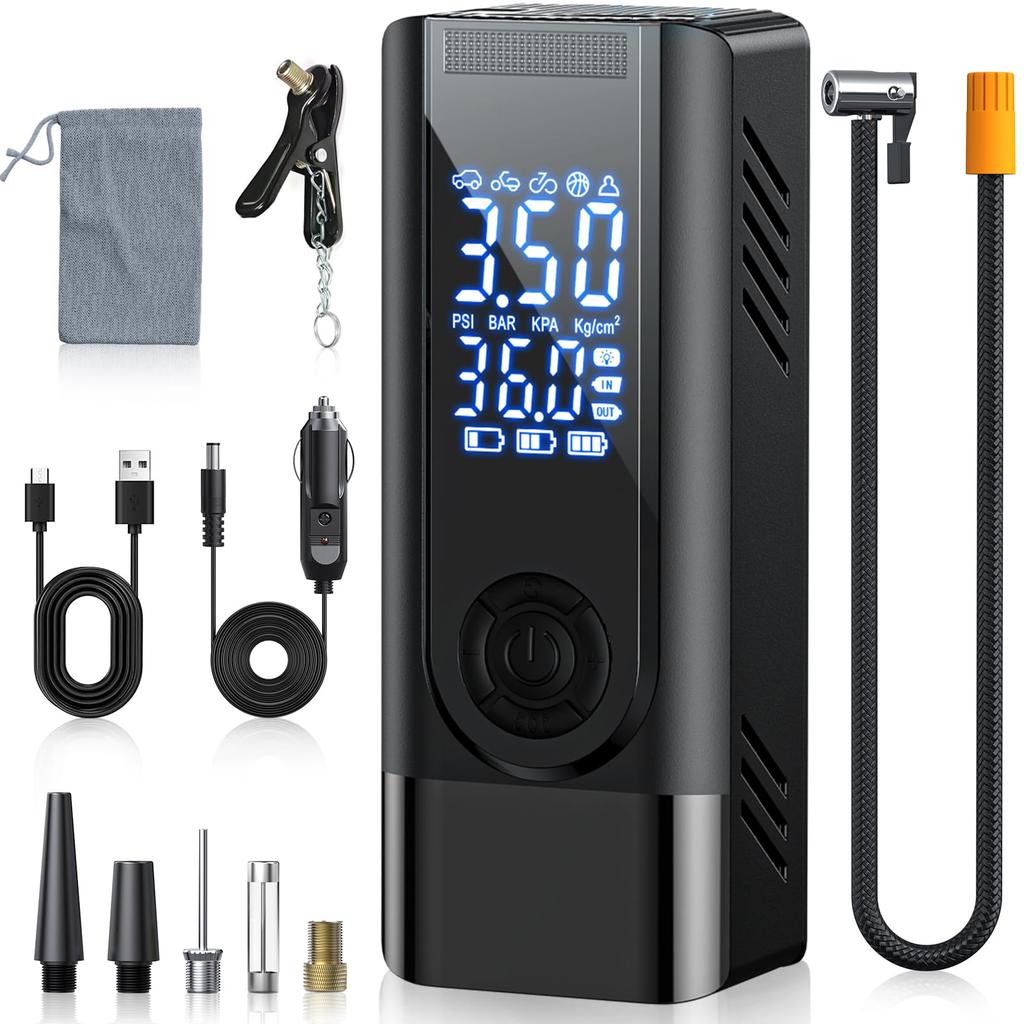 [Высокоэффективный, взрывная скорость накачивания и автоматическое отключение] Этот электрический воздушный насос использует передовой двигатель и турбокомпрессор, работающий со скоростью 25 000 оборотов в минуту, что делает его в восемь раз более эффективным, чем обычные электрические насосы. Он может накачать ваш велосипед с 28 PSI до 36 PSI за одну минуту, что значительно сокращает время накачивания.. Этот умный велосипедный насос оснащен датчиком и функцией автоматического отключения, поэтому вы можете заранее установить давление воздуха, и он автоматически отключится при достижении желаемого давления.. Он автоматически отключается, поэтому вам не нужно беспокоиться о перекачивании или недокачивании.. Прост в управлении, даже для начинающих, не нужно беспокоиться о том, что дети будут неправильно им пользоваться или забудут его выключить.