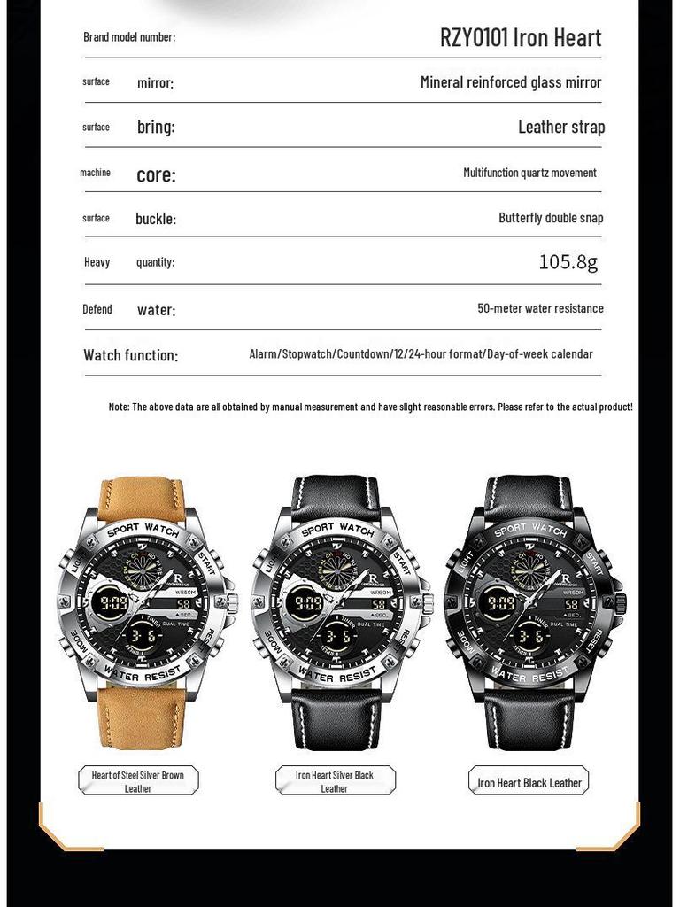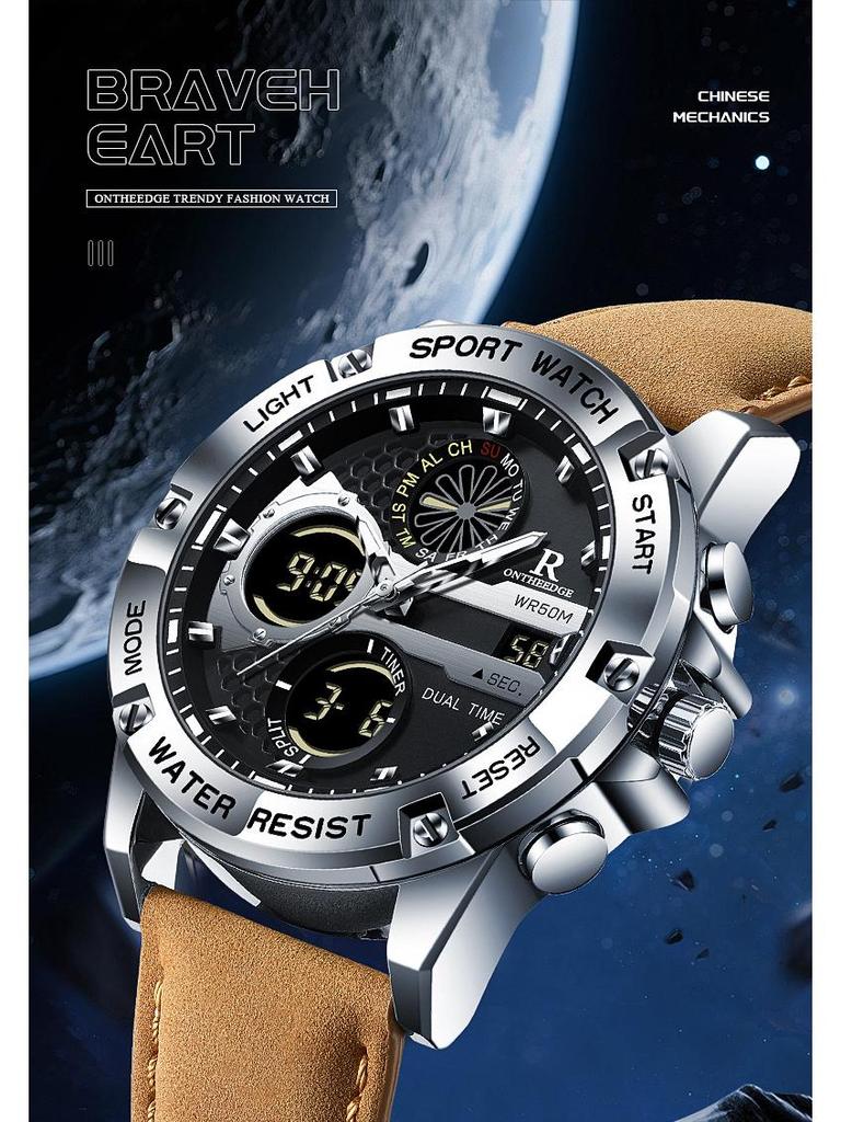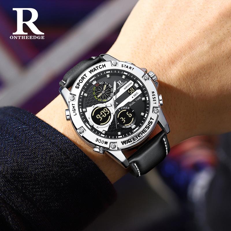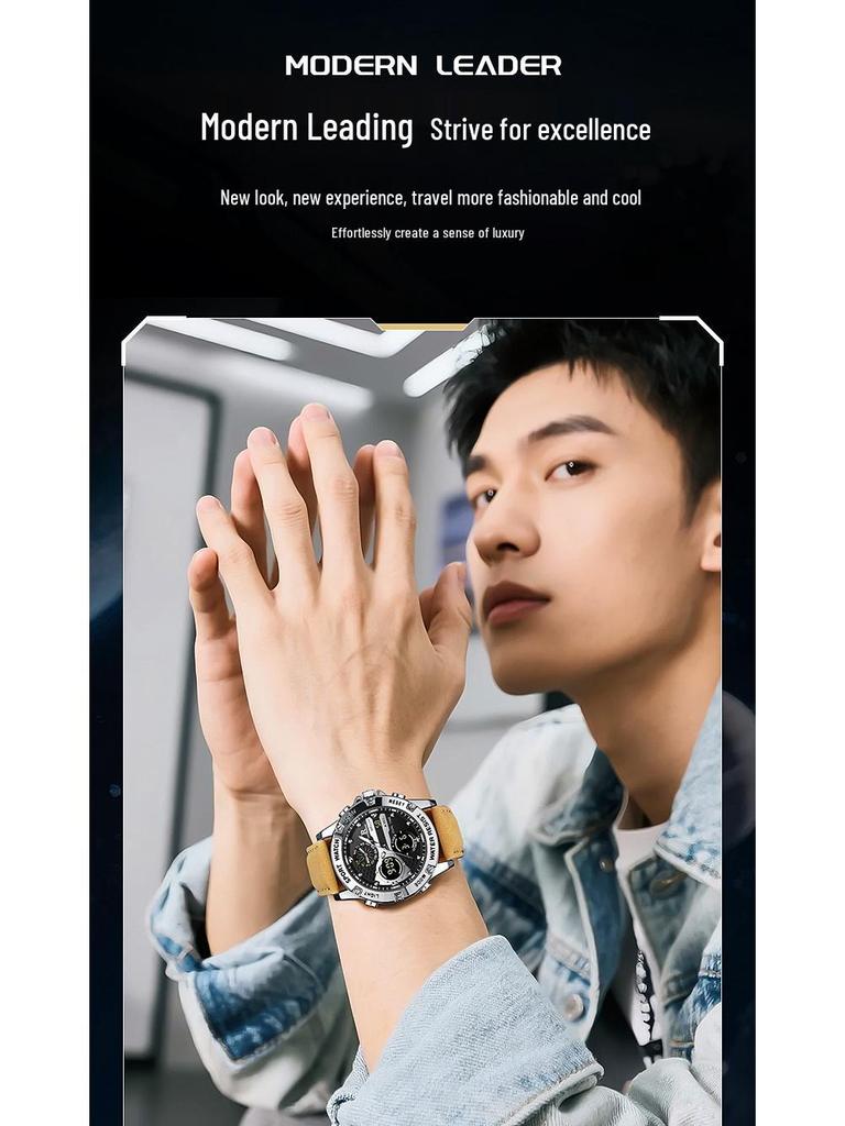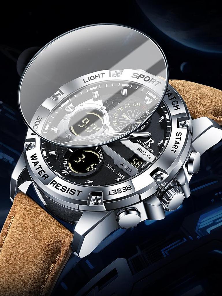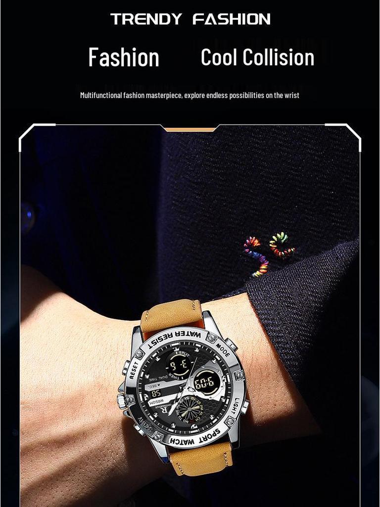 Мужские водонепроницаемые кварцевые часы с двойным дисплеем и кожаным ремешком - Модные, многофункциональные, круглый циферблат, электронная студенческая версия